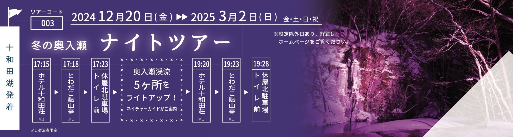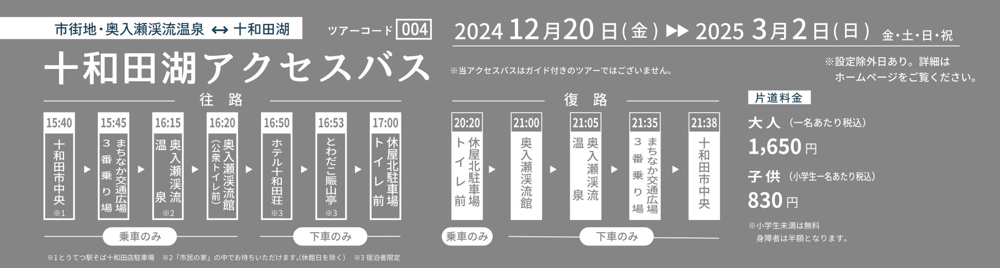 2024年12月20日(金)から2025年3月2日(日)までの金〜日曜日及び祝日、氷雪に覆われる奥入瀬渓流を経由して、「十和田湖アクセスバス」は十和田市市街地・奥入瀬渓流温泉から十和田湖畔休屋を結びます。1日に1往復の運行を予定しており、同期間中に開催する「冬の奥入瀬ナイトツアー」や「十和田湖冬物語」等の参加に大変便利です。バスは片道からご利用いただけます。休屋周辺の宿泊施設や日帰り温泉へのアクセスなど、滞在中のいろんな場面におすすめです。
