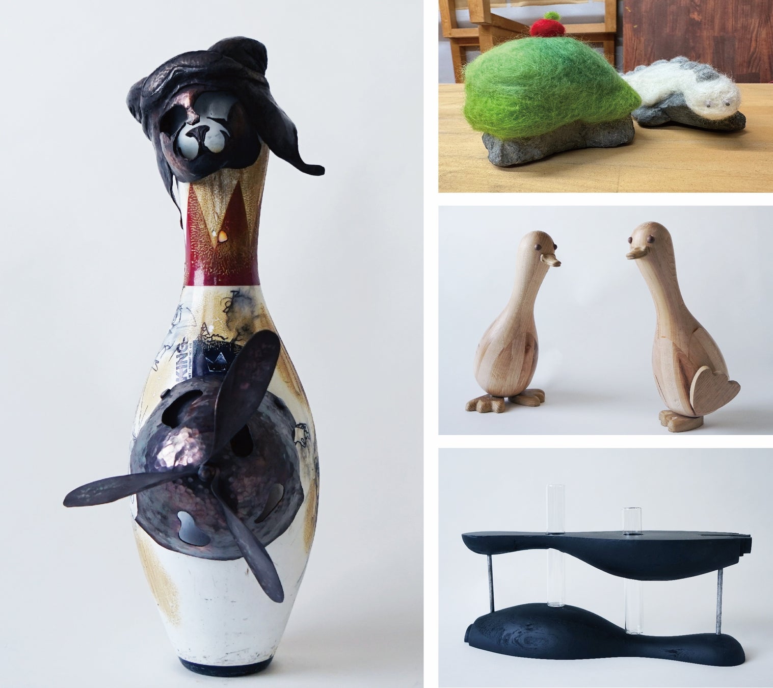 横浜美術大学 クラフトコースの学生、教員による約40点の作品は全て、「廃棄ボウリングピン」をリユースしたもの。あまり知られていませんが、ボウリングピンの中身はハードメイプル(カエデ科の樹木)という堅い木材で作られており、どのようなアートや日用品に変わるかが見どころです。また、今回はボウリングピンに加えて「廃棄サウナストーン」の活用にも挑戦しており、異なる2種の廃材からどのようなアートが生まれるのかにもご注目ください。