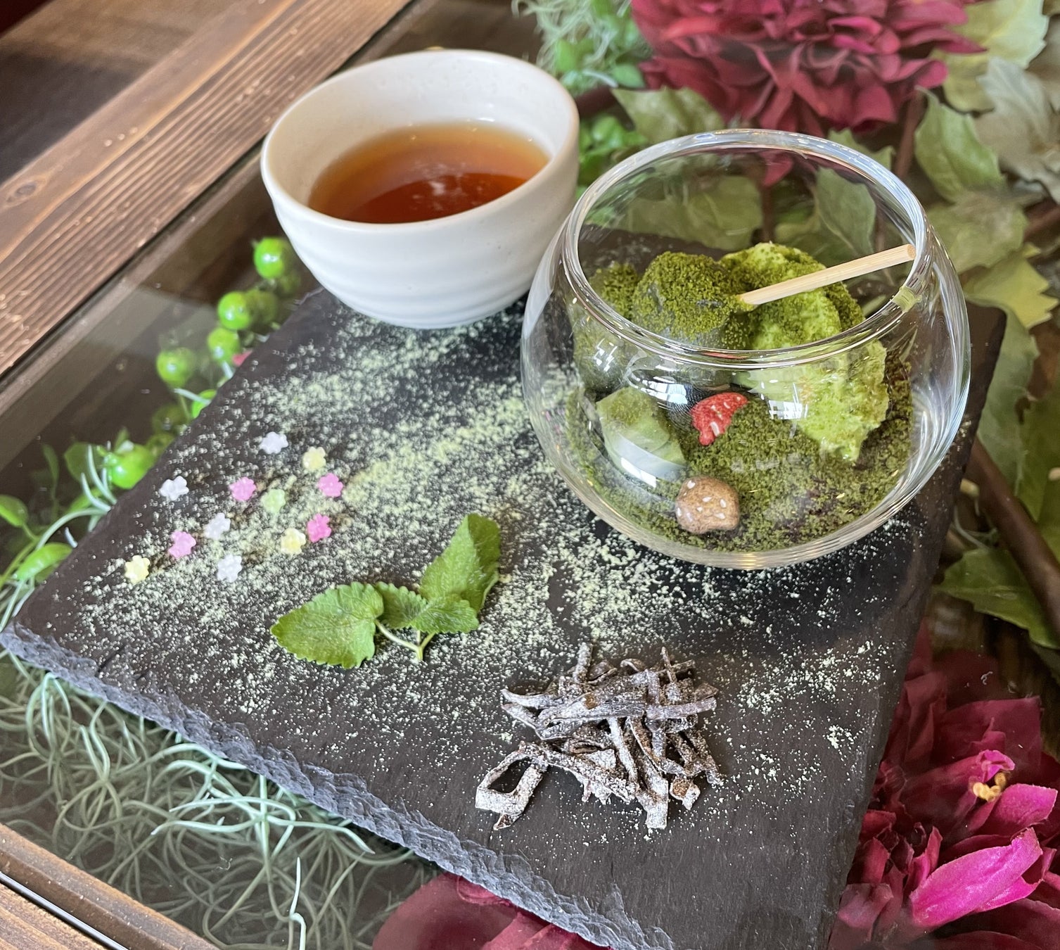 期間限定で「横浜トリエンナーレ応援メニュー 森林のジオラマグラス」をご提供いたします。第8回横浜トリエンナーレのテーマである「野草:いま、ここで生きてる」をイメージしたデザートで、ガラスボールの中に森林のミニジオラマを表現したテラリウムを思わせる1品です。ほうじ茶と一緒にホッとするひとときをお過ごしください。