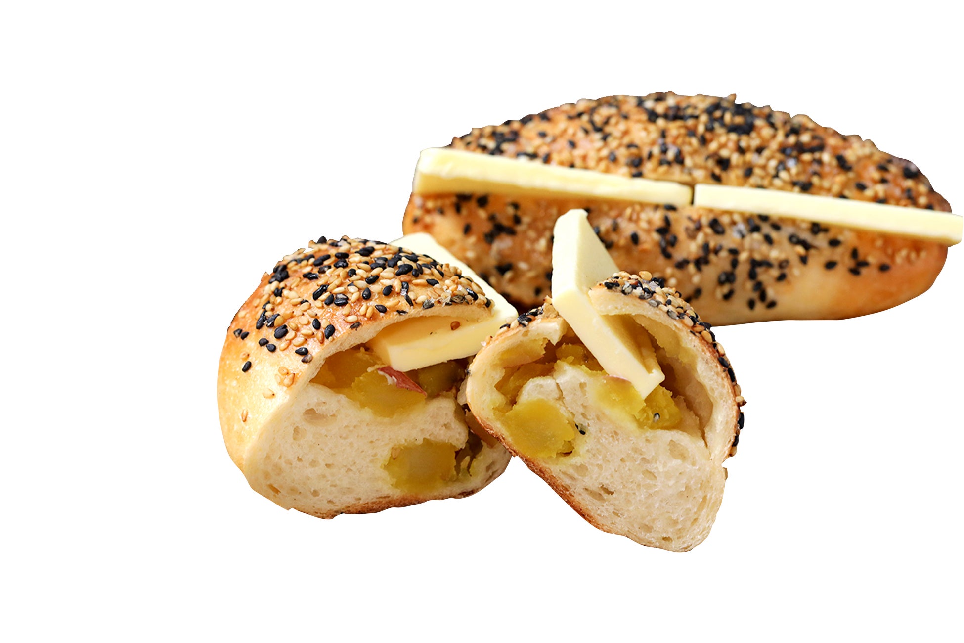 フランスパン生地に有塩バターをダイナミックに挟んだ定番商品『ジャポネ』のおいしさはそのままに、ゴロゴロ入ったさつまいもの甘味と有塩バターの塩味、ごまの香ばしさとザラメの食感が秋を感じさせる一品です。
