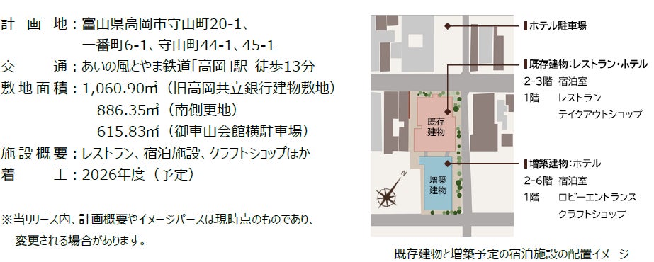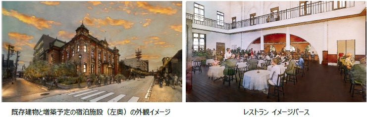 本事業では、同行の文化財的価値に配慮し、その歴史的背景や意匠を尊重したうえで、耐震補強および改修を実施。1階にレストラン、2・3階に宿泊施設を整備し、隣接地に宿泊機能を増築することで、建物全体を一体的に活用する計画です。2028年の開業を目指し、歴史的建築と現代の機能を融合させた新たな交流・滞在拠点づくりを進めてまいります。