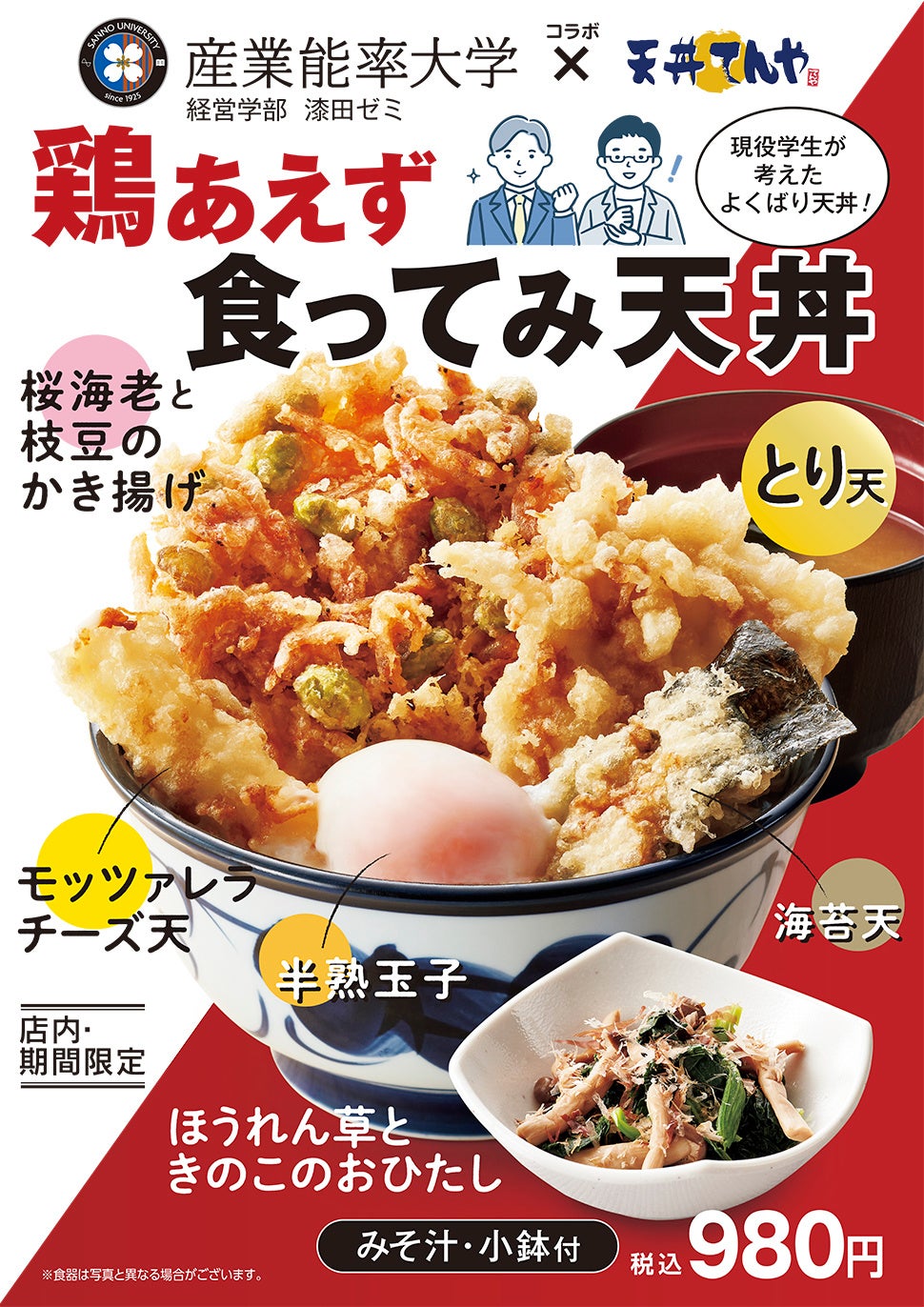『鶏あえず食ってみ天丼』は「毎日頑張っている自分へのご褒美」をコンセプトに、産業能率大学経営学部の学生が開発し、天丼てんやがブラッシュアップしたボリュームのある一品です。サクサク桜海老の香ばしい香りが食欲をそそる「桜海老と枝豆のかき揚げ」、柔らかなむね肉の「とり天」、濃厚な「モッツァレラチーズ天」、「海苔天」をのっけた天丼にとろ~り半熟玉子をトッピング。また付け合わせの小鉢「ほうれん草ときのこのおひたし」はさっぱりとした味わいで、口直しにもぴったりです。