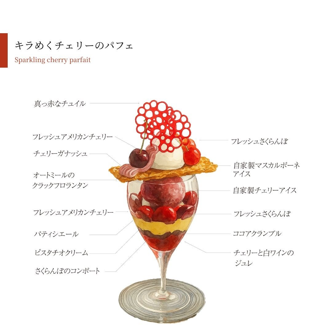このたびご紹介する新作パフェ2種は、主に6月から7月上旬までの約2週間という限られた旬を迎える、希少価値の高いアメリカンチェリーを贅沢に用いた一品と、遊び心あふれる大人のためのお菓子系パフェ。旬の恵みと職人の技が織りなす、唯一無二の味わいをご堪能ください。
