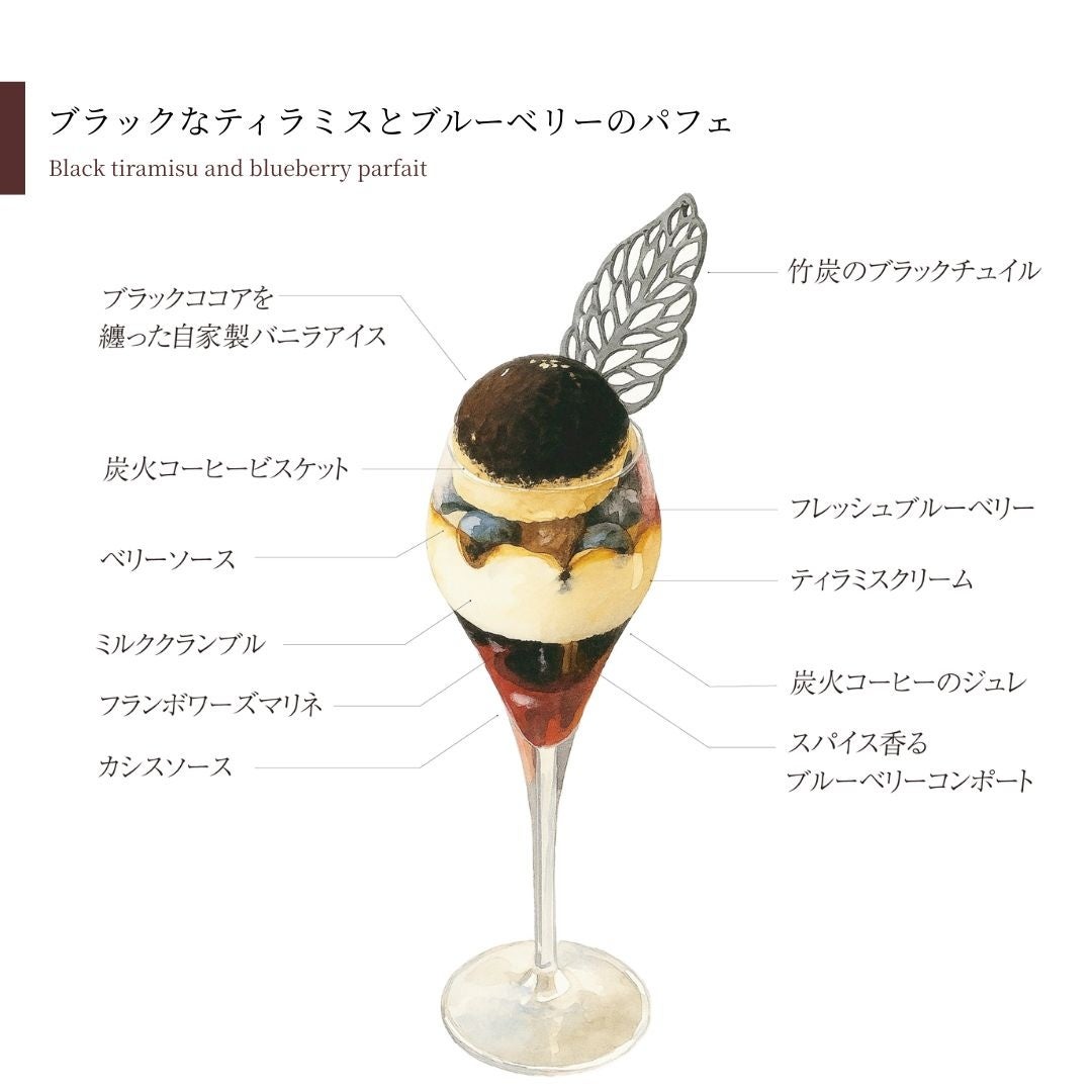 「フルーツが主役のパフェ」をコンセプトとする当店が、時折遊び心を添えて生み出すお菓子系パフェ。ブラックココアと炭火コーヒーの苦みを効かせたティラミス仕立てに、旬のブルーベリーやスパイス香るベリーコンポートを重ね、大人の甘さを表現。炭の風味が香ばしいチュイルやバニラアイスがアクセントになり、一口ごとに味の表情が変化します。