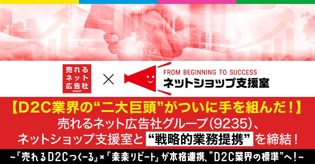 売れるネット広告社グループ(9235)、D2C業界の二大巨頭がついに手を組んだ!ネットショップ支援室と戦略的業務提携を締結〜『売れるD2Cつくーる』×『楽楽リピート』が本格連携D2C業界の標準へ 〜