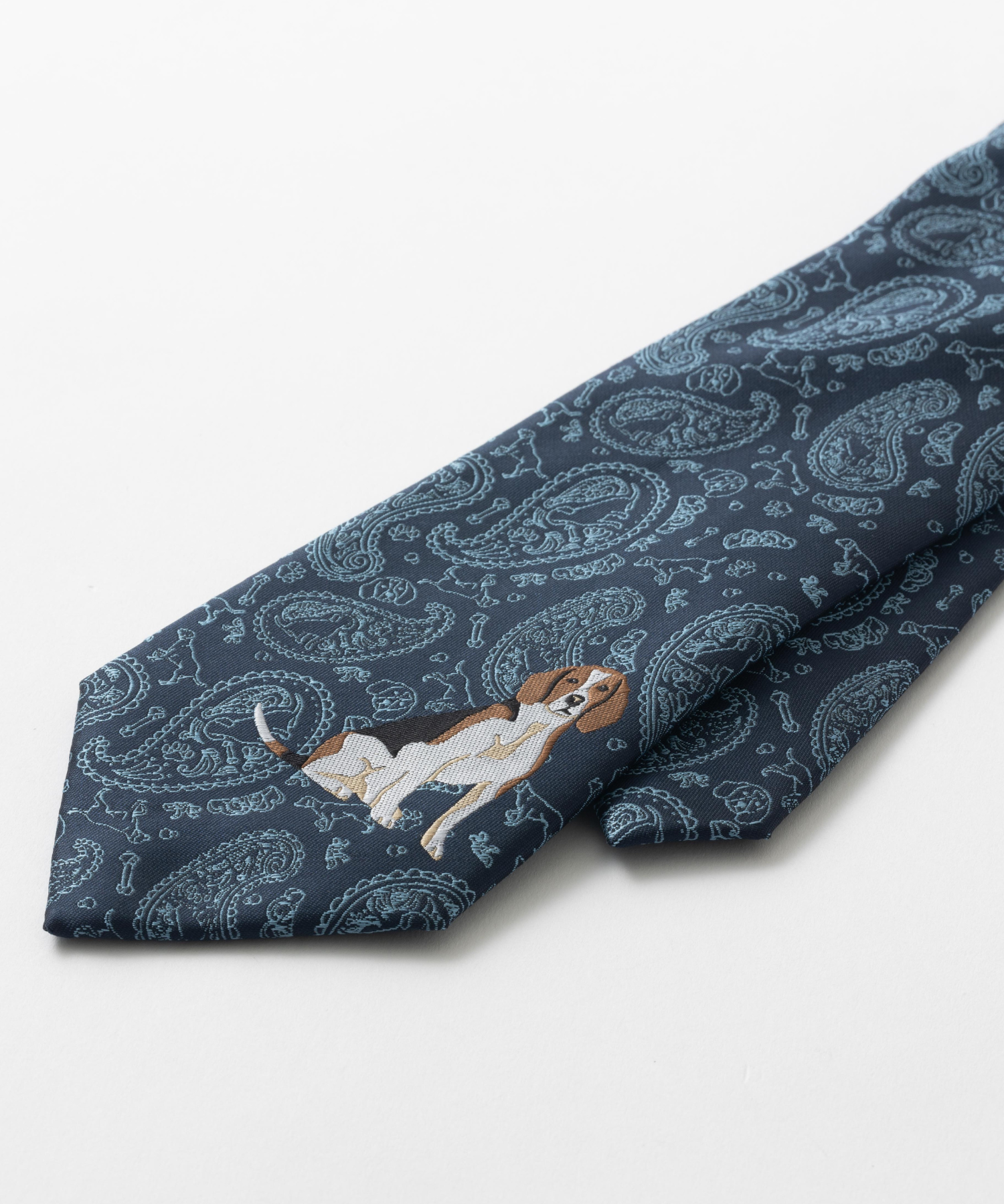 きちんと感のあるネクタイに、小さくあしらわれた犬の刺繍が入った