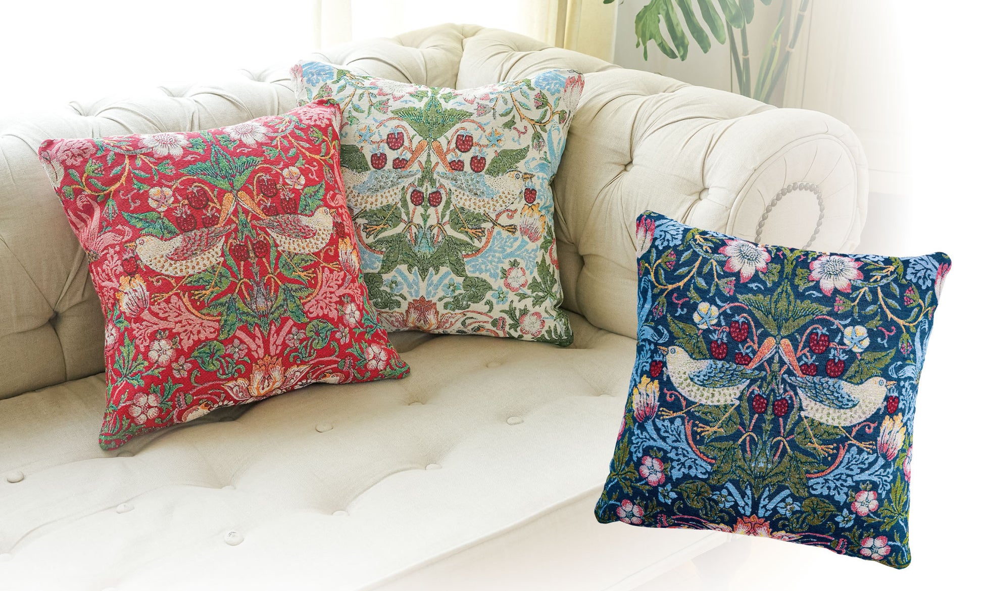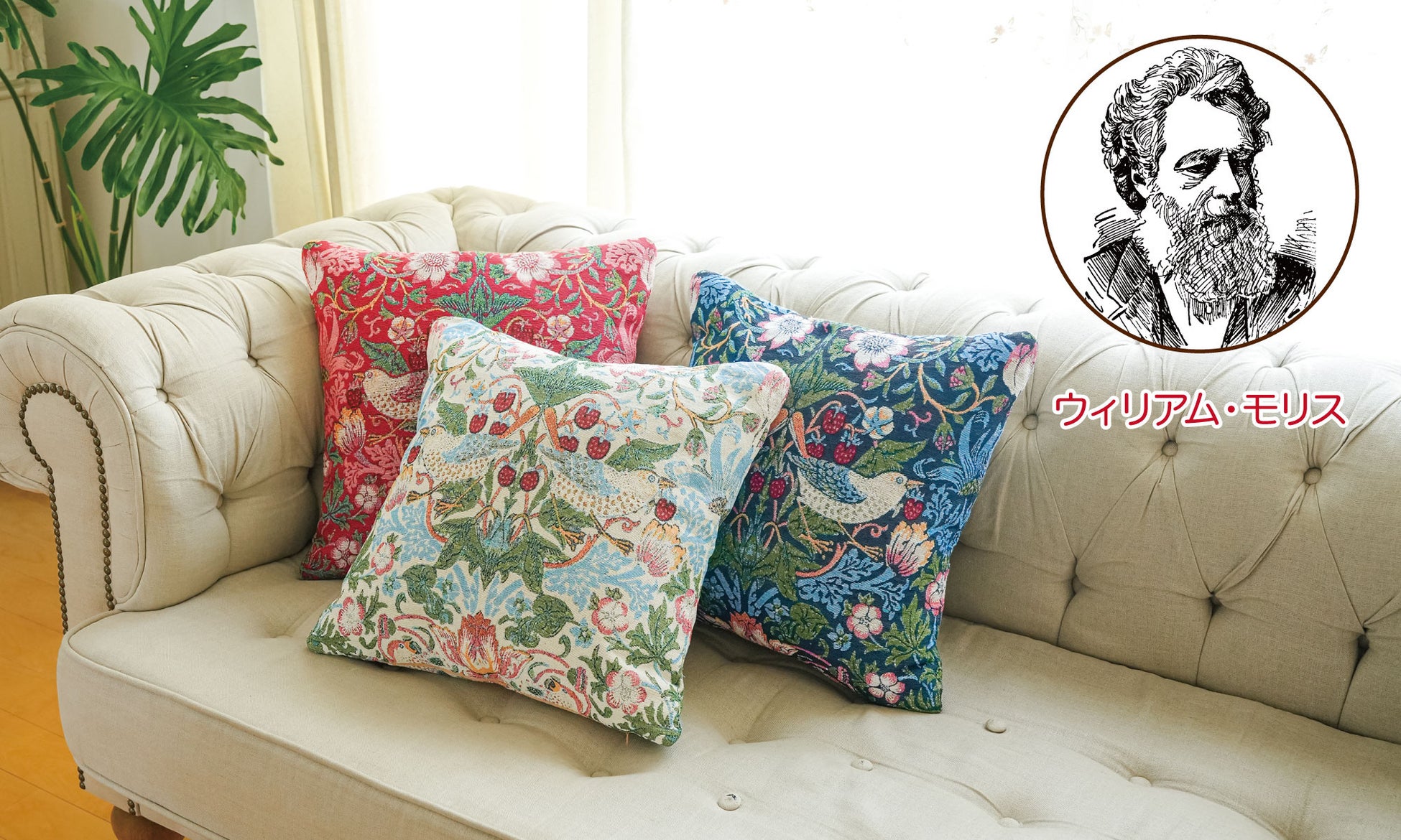 日常を明るく、華やかに♪モリスの「いちご泥棒」をジャガード織りで表現したクッションカバー。