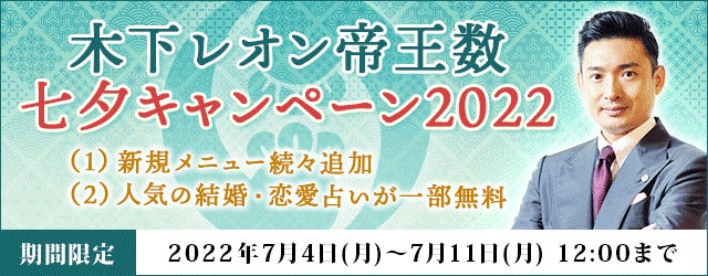 フジテレビ系列で放送中の占い番組『突然ですが占ってもいいですか?』で人気を博している木下レオン。この度、月額公式サイト『木下レオン◆帝王数』にて、『木下レオン帝王数 七夕キャンペーン2022』を公開中です。キャンペーン期間中、新規メニューを続々追加するほか、サイト内で人気の結婚・恋愛占いが一部無料で鑑定可能となっております。ぜひこの機会にご利用ください。