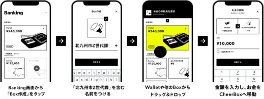 「北九州市Z世代課」を含む名前を付けたCheer Boxにお金を預けることで、応援する“あなた”に代わり、みんなの銀行がCheer Boxに集まった預金残高の1%相当を北九州市Z世代課に寄付します。支援金は、Z世代はみ出せコンテスト受賞者のプロジェクト運営費に充てられます。