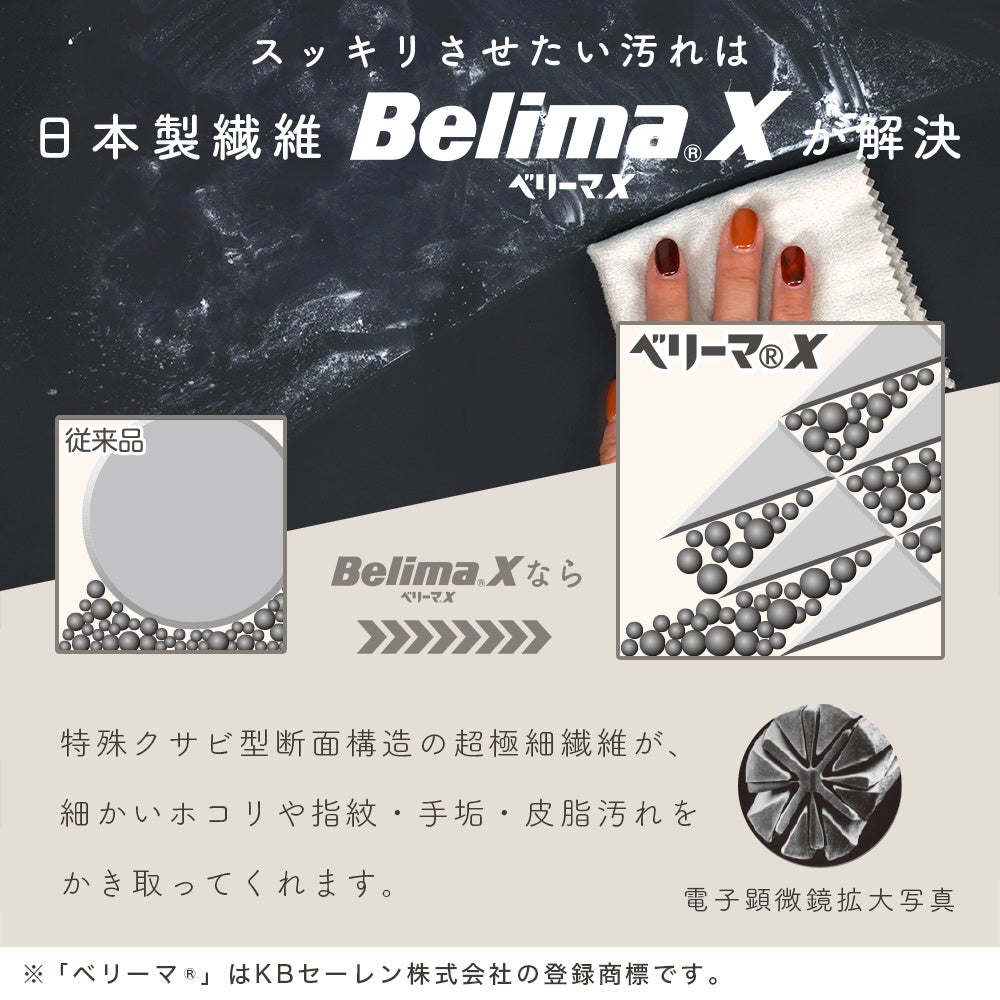 超極細繊維BelimaX使用のマイクロファイバークリーニングクロスです。スマートフォンやタブレットだけでなくプラスチック製品などあらゆる場面で活躍してくれます。洗濯もできるのでいつでも清潔にご利用いただけます。
