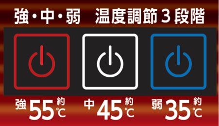 高温(約55℃)・中温(約45℃)・低温(約35℃)の3段階で温度調節が可能。ヒーターが不要な際は電源をオフにすれば肌寒い屋外・暖房のきいた室内など、冬特有の温度変化に柔軟に対応します。