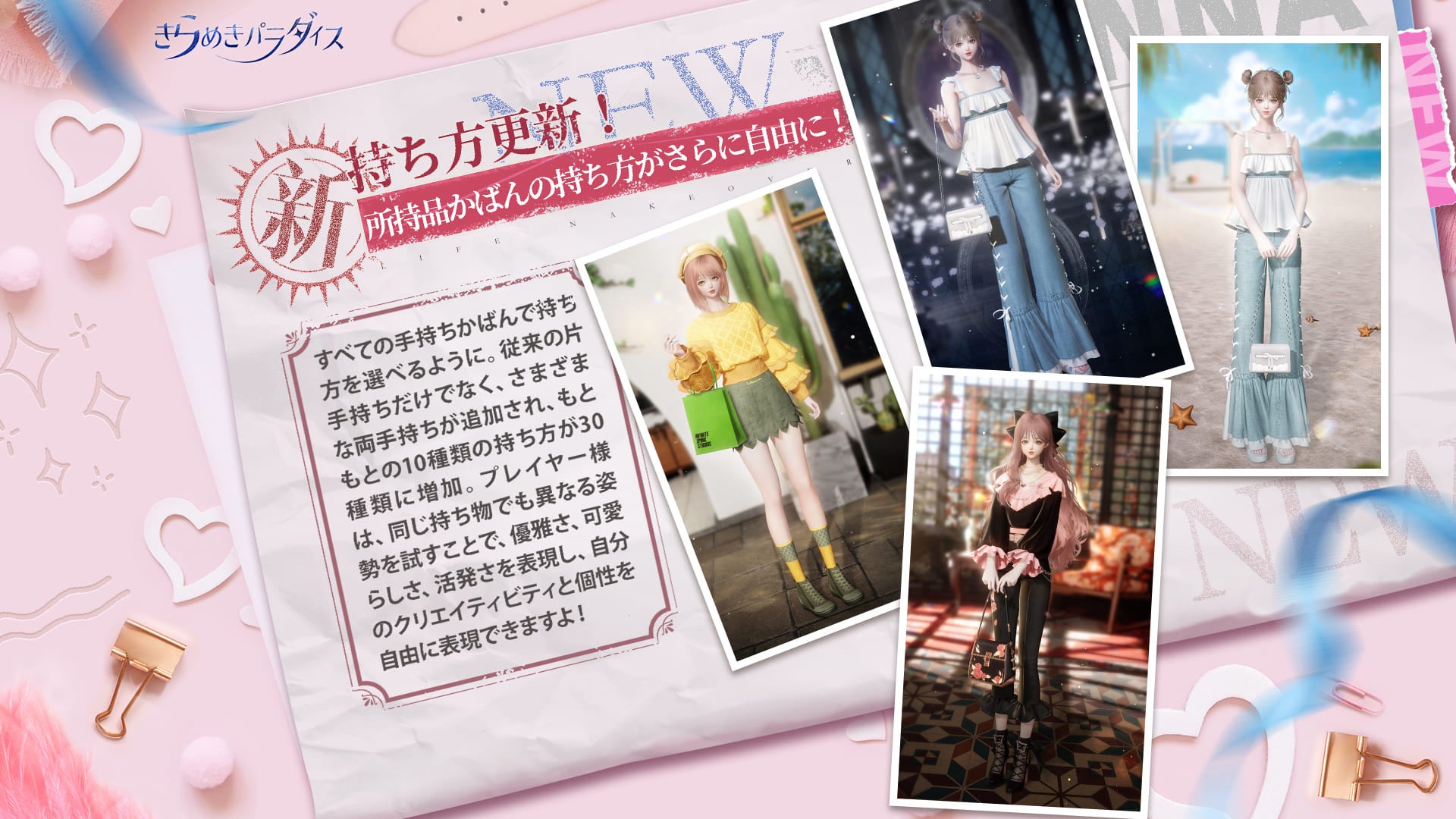 VVANNA STUDIOは、次世代ガールズドリームRPG『きらめきパラダイス~自由につくれる夢の世界へようこそ~』において、多数機能が実装されることをお知らせします。一人称視点や撮影機能、手持ちかばんの持ち方レパートリー大量追加など、着せ替えの幅がさらに広がります!