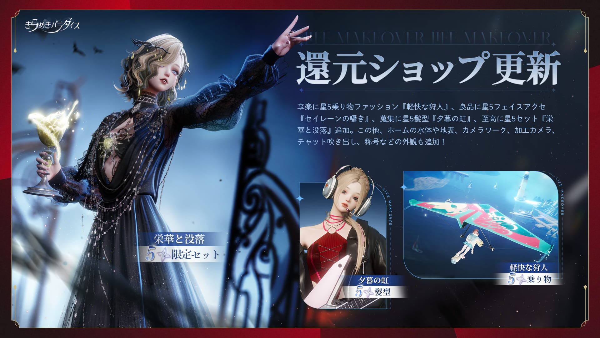 さらに良品には星5のフェイスアクセ【セイレーンの囁き】、蒐集には星5髪型【夕暮れの虹】、至高には星5セット【栄華と没落】が追加。還元ショップでは、ホームの水面、地表、撮影カメラワーク、加工カメラ、チャット吹き出し、称号などの外観も新たに追加。ぜひお気に入りの新商品を交換してください!