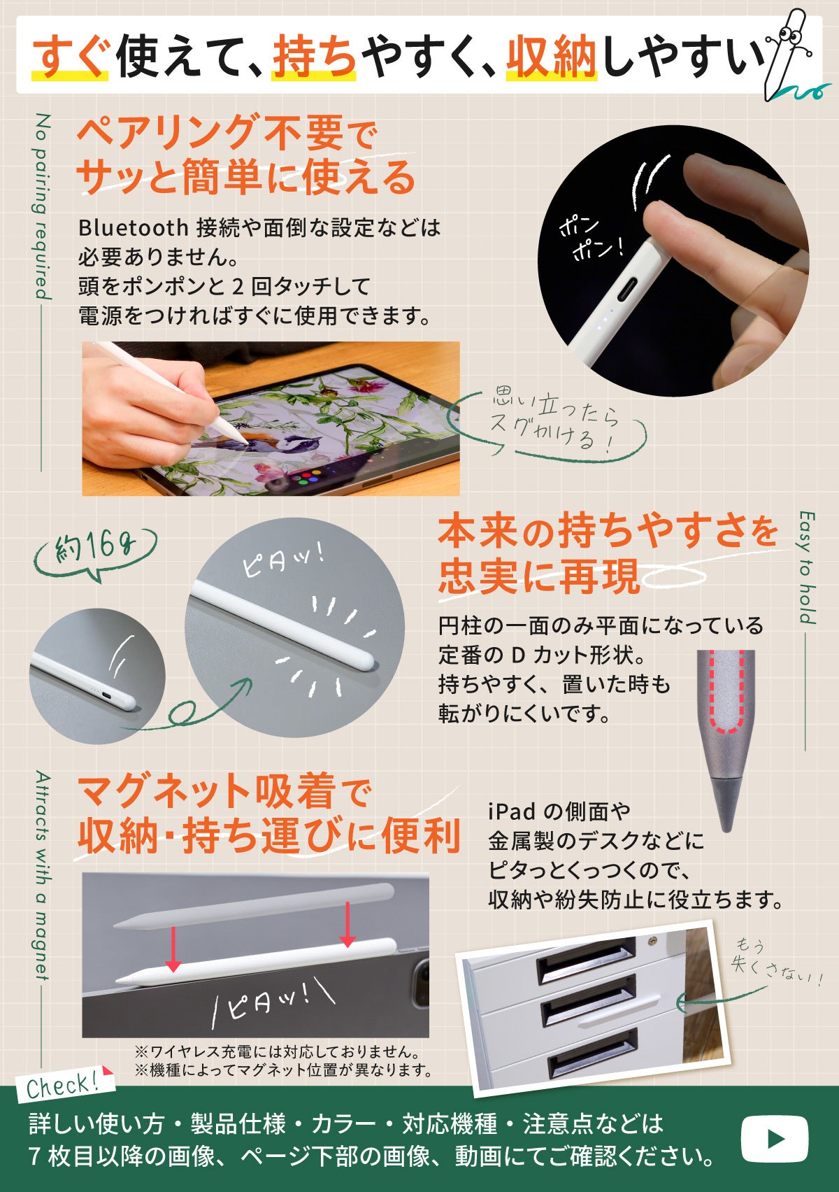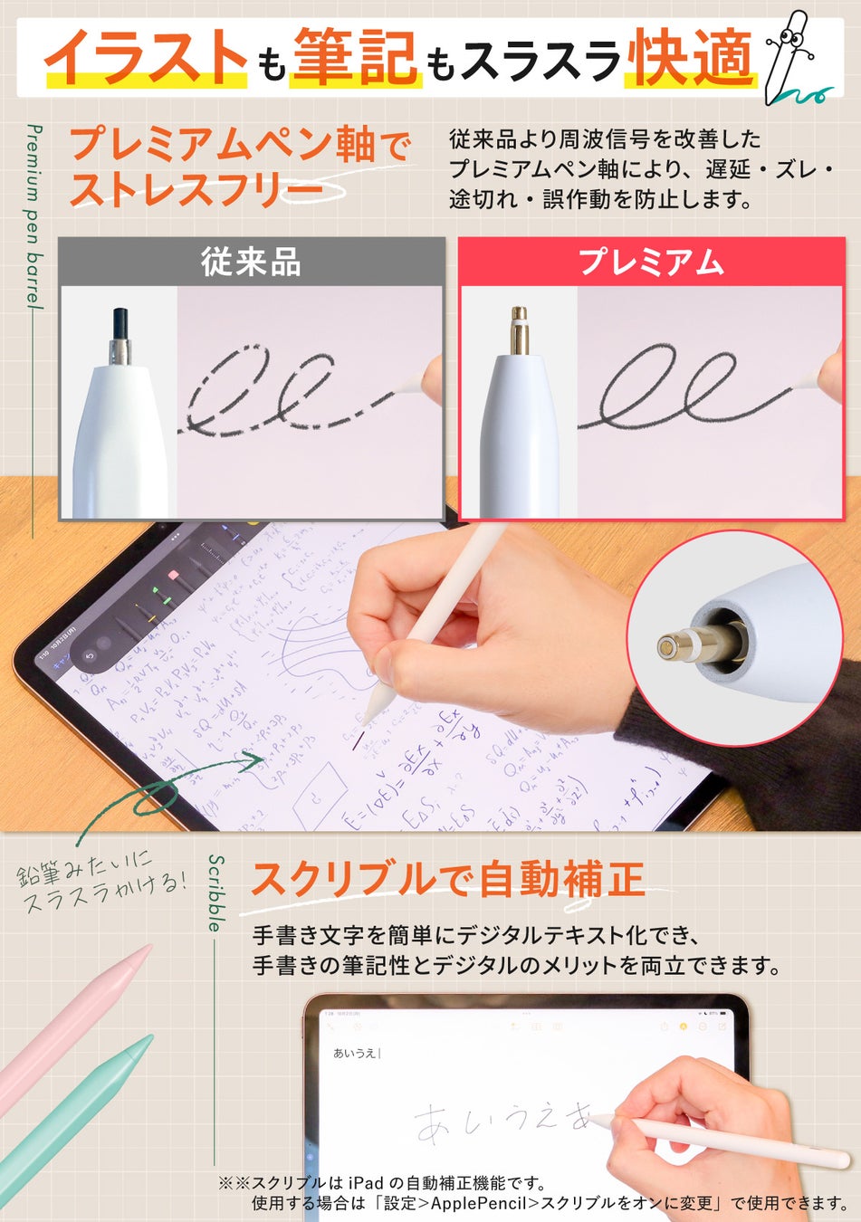 【発売記念セール】iPad 用 スタイラスペン「スラスラかける君」傾き検知 パームリジェクション マグネット吸着 対応。イラスト、大学のノート、お子様のお絵描き等におすすめの"お手頃"タッチペンです。