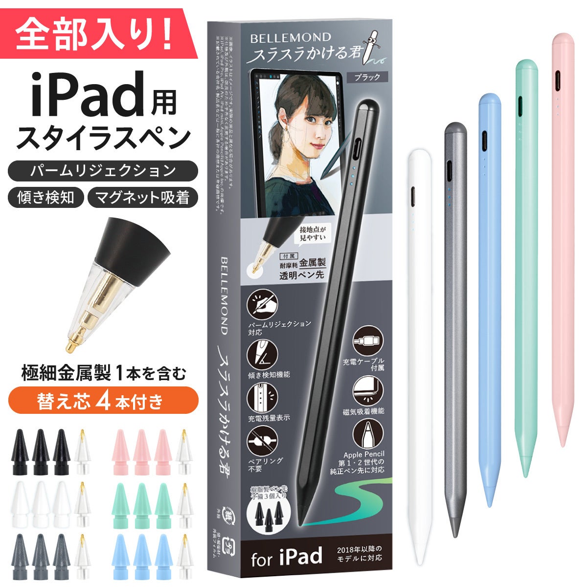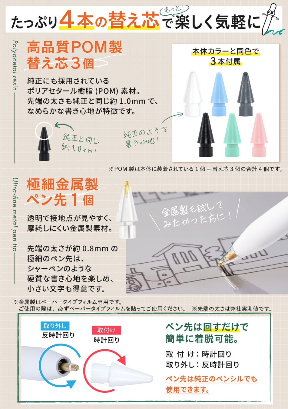 アイパッドで漫画を描く、大学生活の授業中のノート代わりに使う等、サブペンとしてやペンシル初心者にもオススメ。Apple Pencil に互換性のある交換用ペン先4個付き(POM製3個・細い金属製1個)