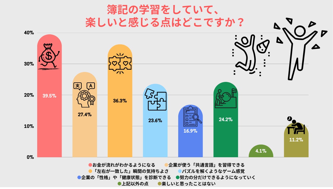 簿記の学習において「楽しいと感じる点」を調査したところ、「お金の流れがわかる(39.5%)」に次いで、「左右が一致した瞬間の気持ちよさ(36.3%)」が上位にランクイン。「努力の分だけできるようになっていく(24.2%)」、「パズルを解くようなゲーム感覚(23.6%)」という回答も多く、学びそのものを楽しいと感じている簿記学習者が多いことがわかりました。