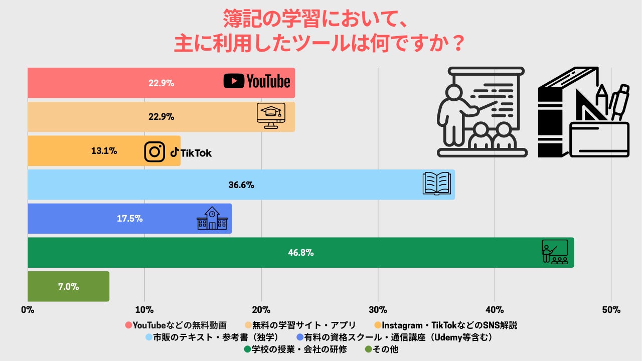 簿記の学習において利用したツールについて調査したところ、「学校の授業・会社の研修(46.8%)」以外では、「市販のテキスト・参考書(36.6%)」に続いて「YouTubeなどの無料動画(22.9%)」や「無料学習サイト・アプリ(22.9%)」の活用が多い結果となりました。学びに使用するツールの多様化が進んでいます。