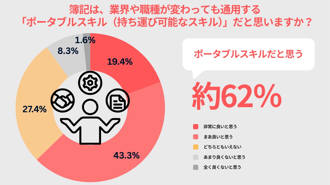 業界や職種が変わっても通用する「ポータブルスキル」だと思うかという問いに対し、62.7%が「そう思う」と回答。特定の業界に依存しない、どこへでも持ち運び可能な「一生モノのスキル」としての信頼が厚いことがわかります。