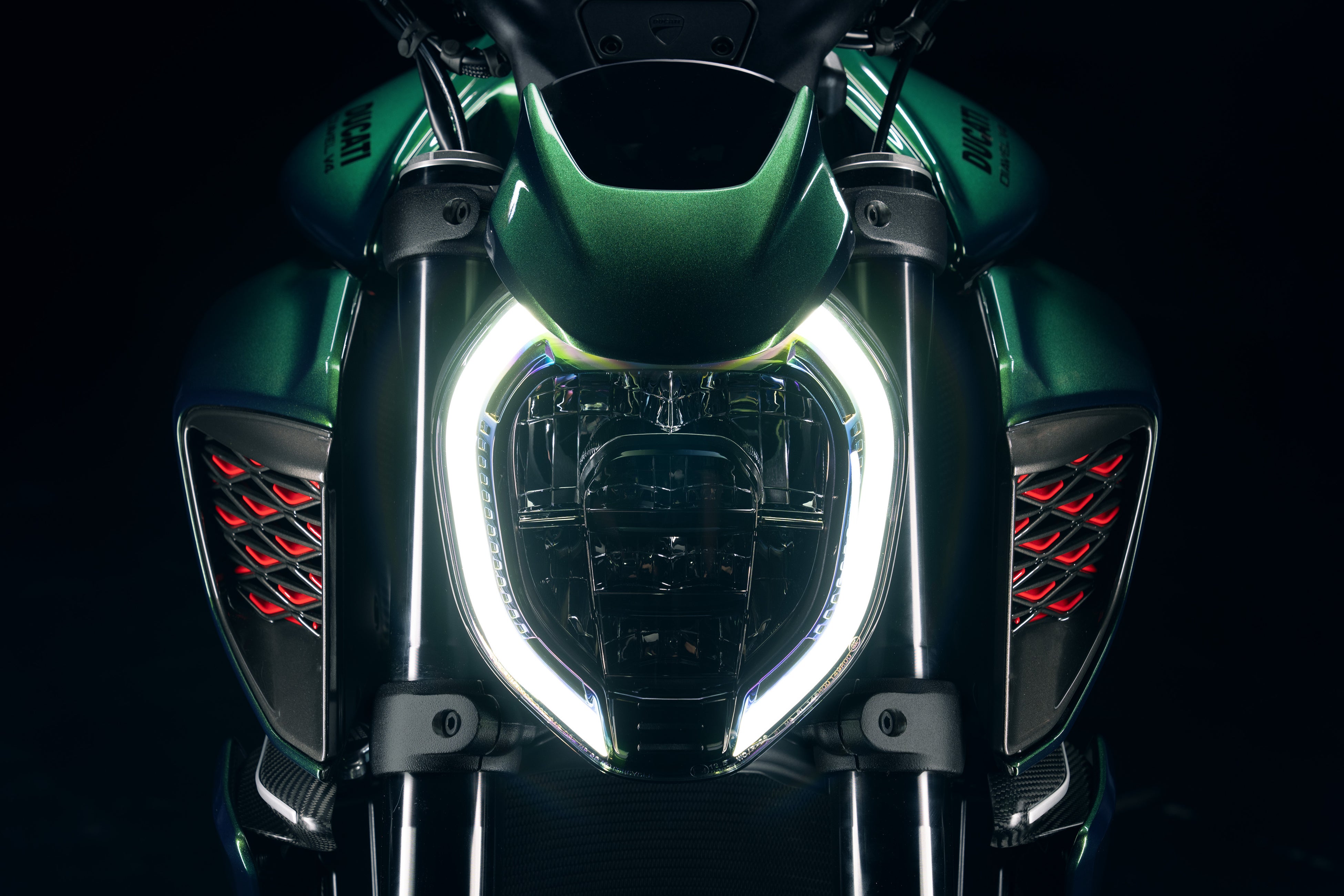 ドゥカティ スタイル センターは、ベントレーのデザイナーとのコラボレーションにより、この特別なモーターサイクルのために新しいデザインを生み出しました。ベントレーマリナーのカラーパレットから採用された、洗練された豊かな色調のメタリックカラーであるスカラベ・グリーンは、車体全体に使用されています。