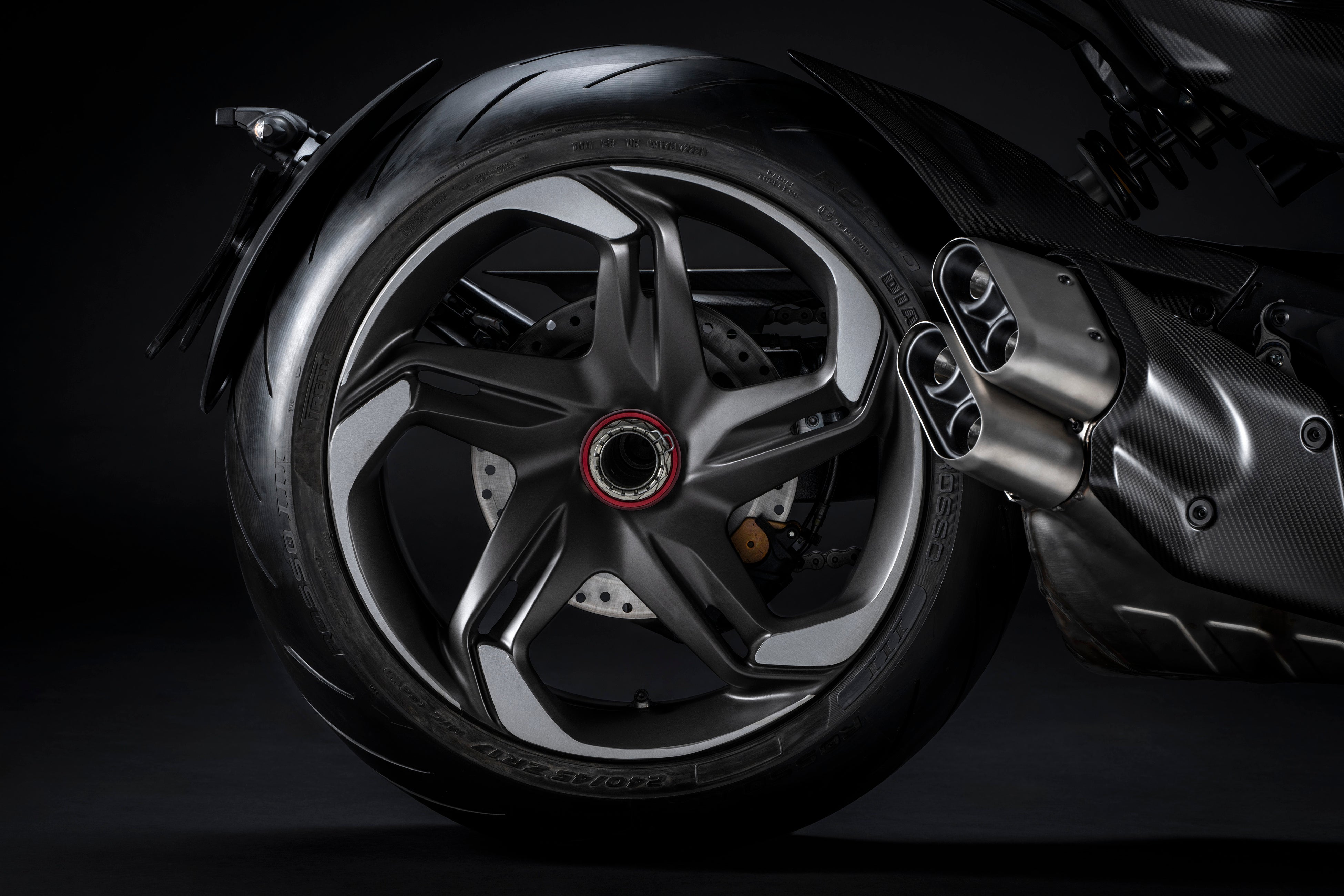 ディアベルV4の決然としたアグレッシブなラインは、テクニカルコンポーネントによっても大きく見直されています。このバイクのために設計・製作された鍛造リムは、自動車の形状を想起させ、ダークチタニウムサテンに塗装され、機械加工された表面の一部が見えるようになっています。