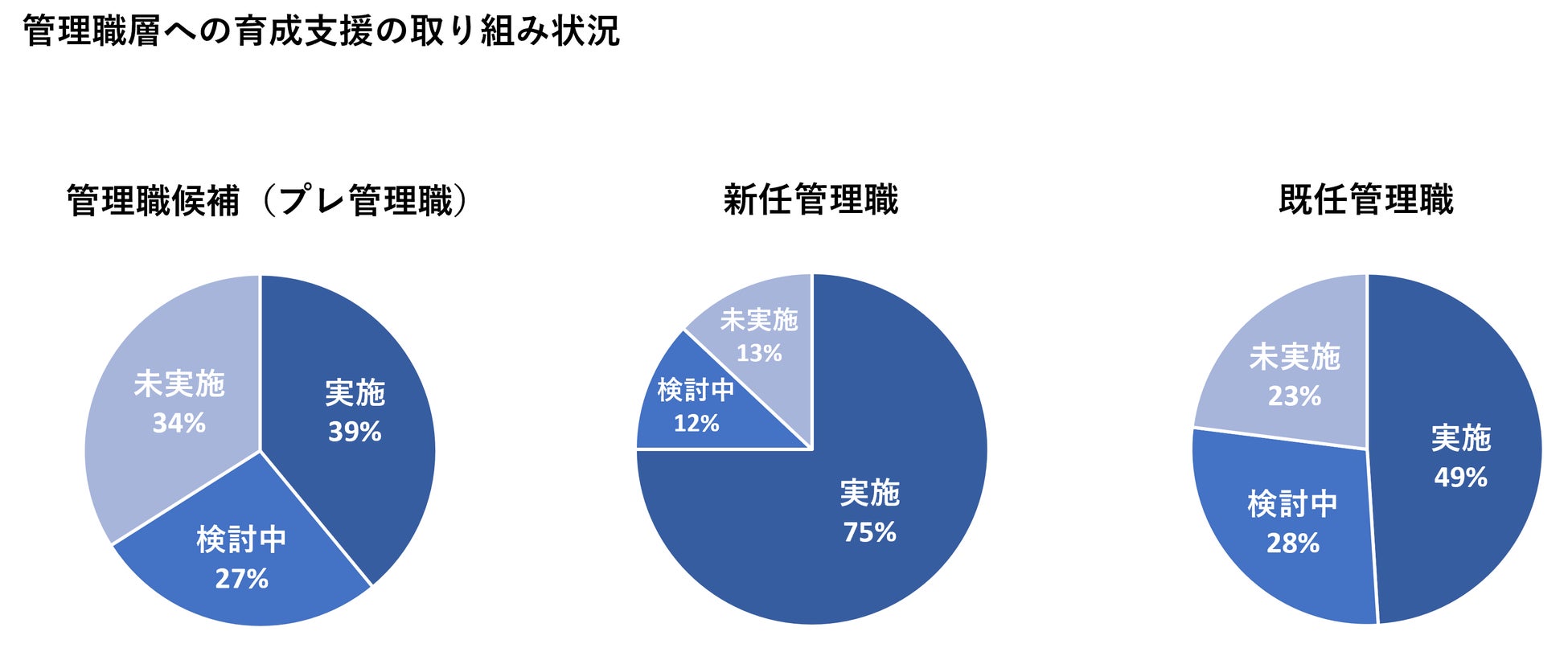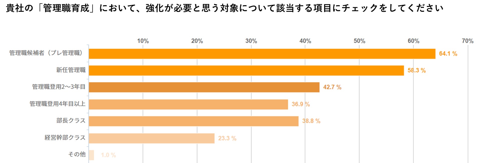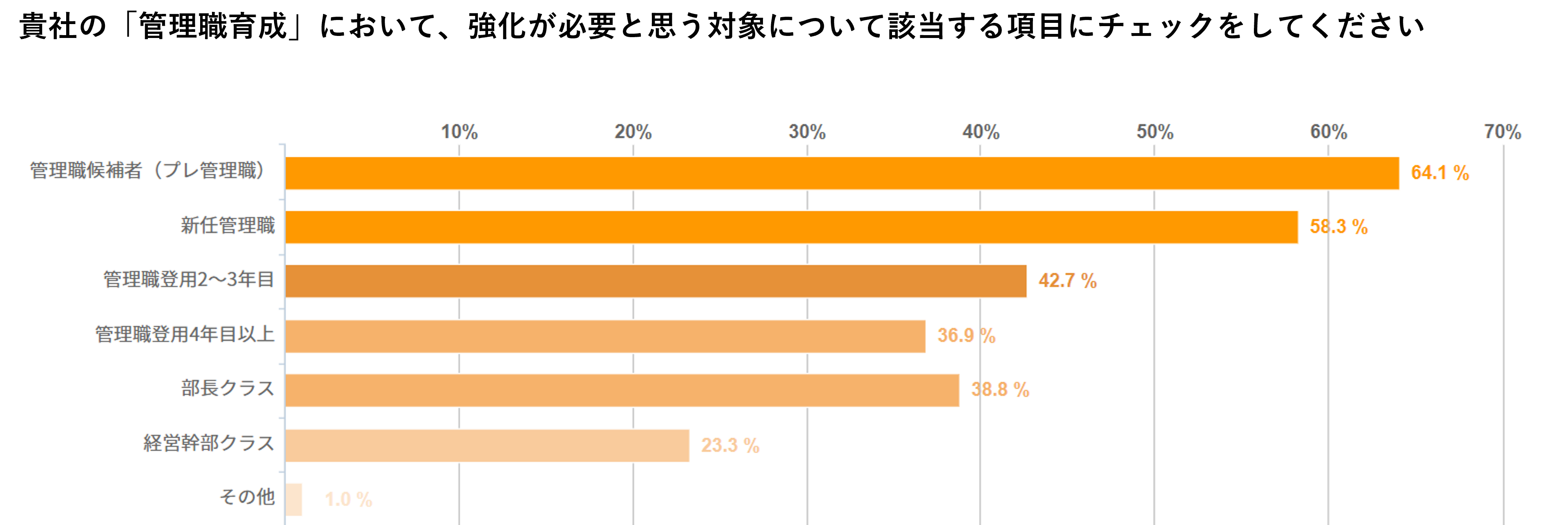 「管理職層への育成支援の取り組み状況」について、新任管理職対象では実施率7割以上、既任管理職は約5割といった結果のなか、管理職候補(プレ管理職)に対しては実施率約4割と、手薄であることがわかりました。一方、「強化が必要だと思う対象」について聞いたところ、管理職候補(プレ管理職)が64%ともっとも高い回答割合になりました。このことから、支援の必要性を感じていながらも、まだ手がつけられていない状況にあることがわかります。