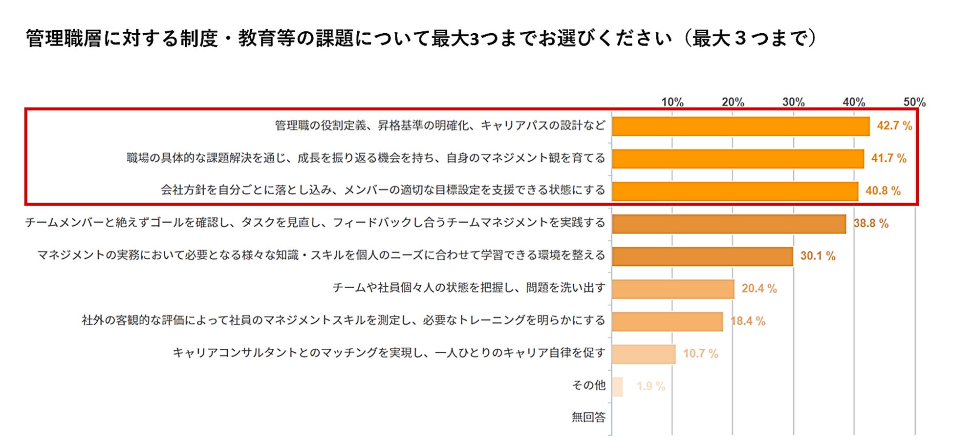 管理職層に対する制度・教育等の課題について聞いたところ、①「管理職の役割定義、昇格基準の明確化、キャリアパスの設計」(42.7%)、②「職場の具体的な課題解決を通じ、成長機会を振り返る機会を持ち、自身のマネジメント観を育てる」(41.7%)、③「会社方針を自分ごとに落とし込み、メンバーの適切な目標設定を支援できる状態にする」(40.8%)、が特に課題感の強い項目であることがわかりました。これらはそれぞれ、①人事から管理職への支援、②管理職自身の成長、③管理職から会社・メンバー双方への働きかけ という要素を持っており、管理職育成支援は多方面から複合的に行うことが求められていると考えられます。
