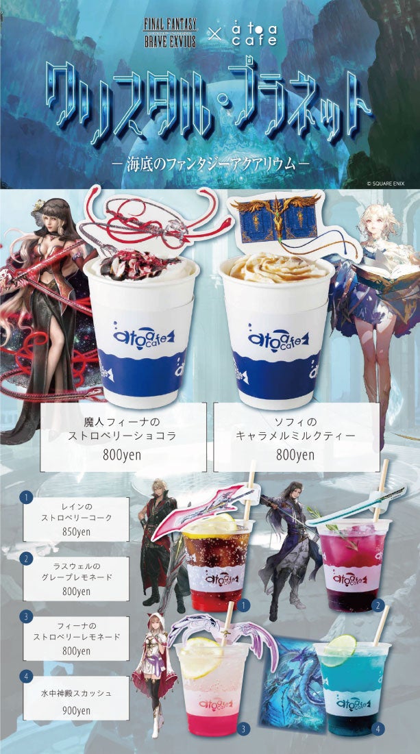 AQUARIUM×ART átoa(兵庫県神戸市中央区、以下『アトア』)では、現在開催中の「ファイナルファンタジー ブレイブエクスヴィアス」(以下『FFBE』)とのコラボ企画展『クリスタル・プラネット -海底のファンタジーアクアリウム- 』の連動企画として、ゲーム内に登場する人気キャラクターをモチーフにしたオジリナルコラボカフェメニュー第2弾で、寒い冬に嬉しいホットドリンクを販売いたします。