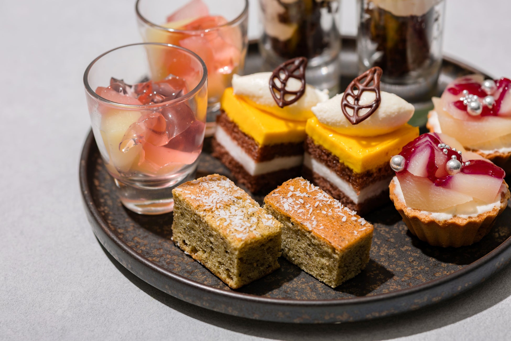 ジューシーな白桃を使用した「ピーチショートケーキ」や「マンゴーと杏仁のプリン」など、見た目にも涼やかで上品なスイーツが揃います。さらに、豊洲直送の旬の食材を取り入れたセイボリーにも一緒にお楽しみください。