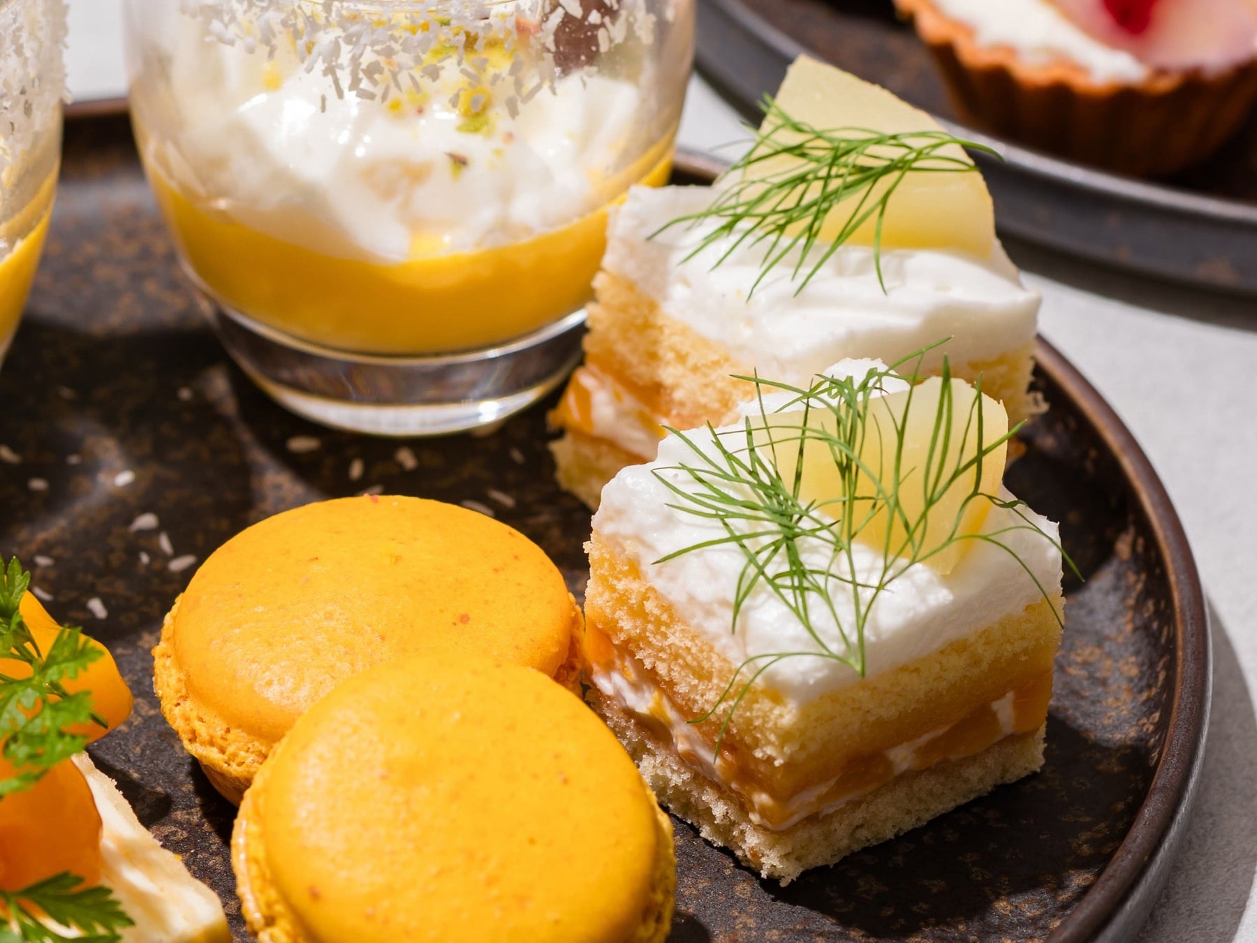 ① マンゴーとライチのムース ② マンゴーロール ③ レモンのマカロン