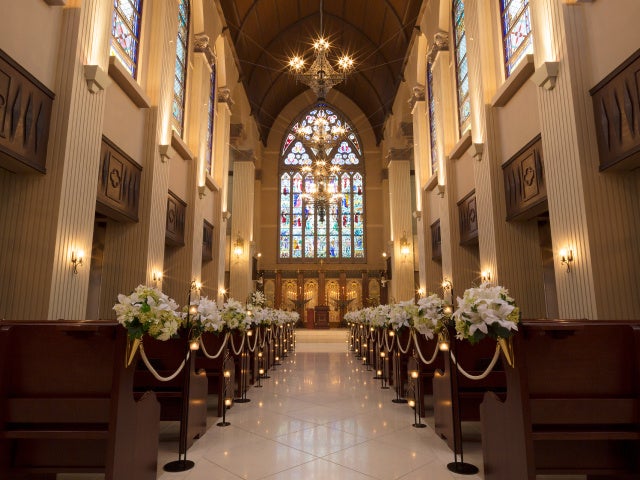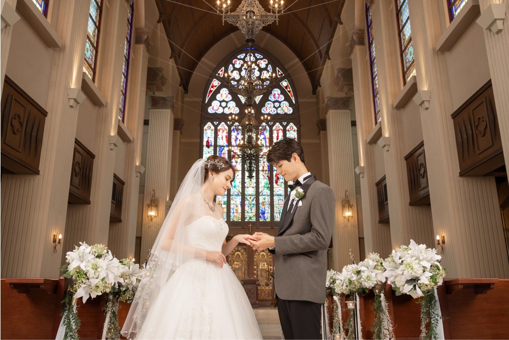 ブルーミントンヒルの大聖堂で本番同様の演出で行われる挙式をゲスト目線で体験。ベールやトレーンが美しく広がるバージンロードや光が差し込むステンドグラス、フラワーシャワーやサプライズ演出など本番さながらの挙式をご覧いただけます。結婚式のイメージがよりリアルに。1日3回開催。