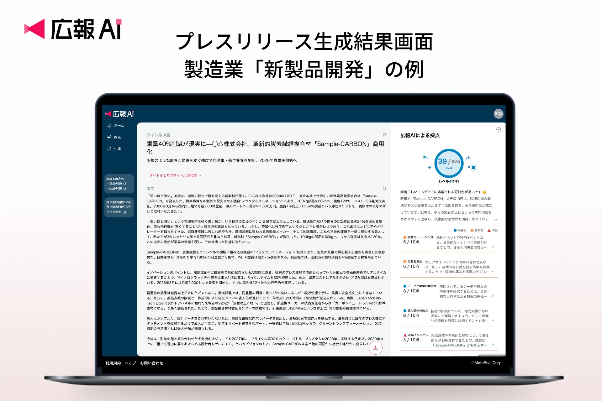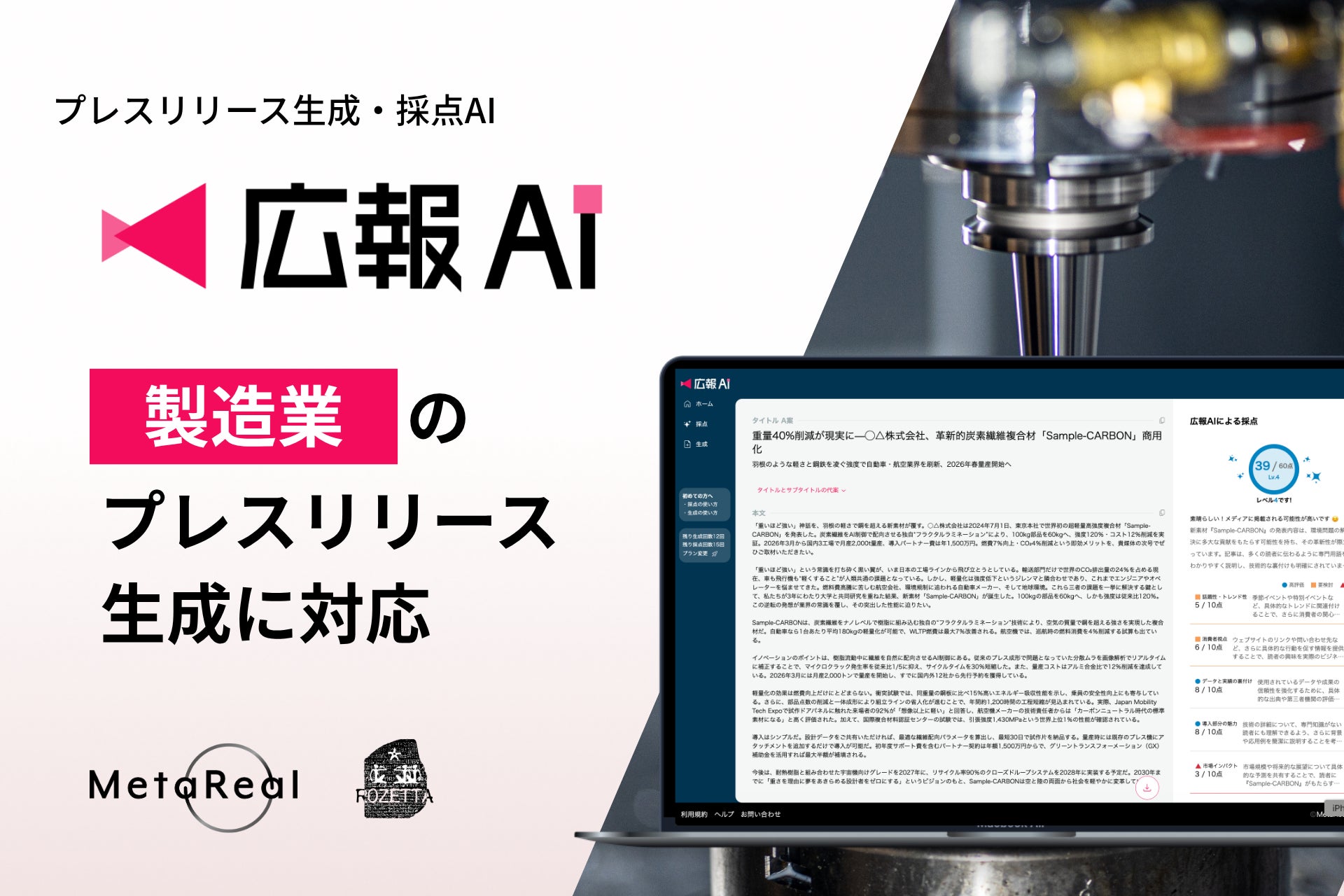 業種特化の専門AI開発・運営を行うメタリアル・グループの株式会社ロゼッタ(本社:東京都千代田区、代表取締役:五石 順一)が提供する、メディアに掲載されやすいプレスリリースを生成・採点可能な『広報AI』が、製造業のプレスリリース作成に対応しました。高度な技術や専門用語が多くなりがちな製造業の広報課題に対し、AIが製品説明書や仕様資料などから、わかりやすく伝わる文章を自動生成することで、情報発信の質とスピードの両立を支援します。
