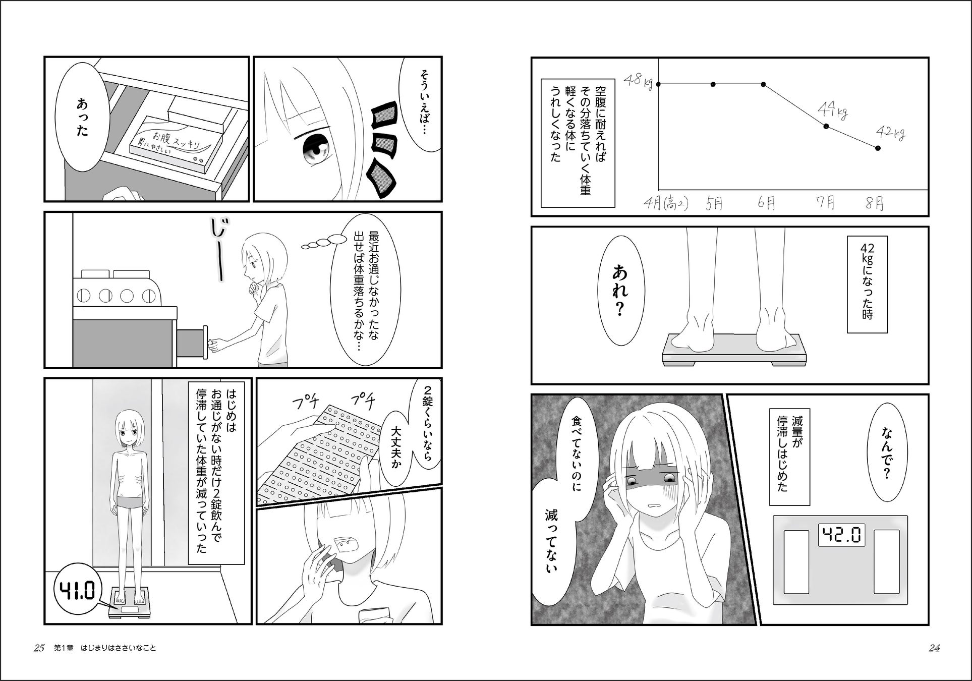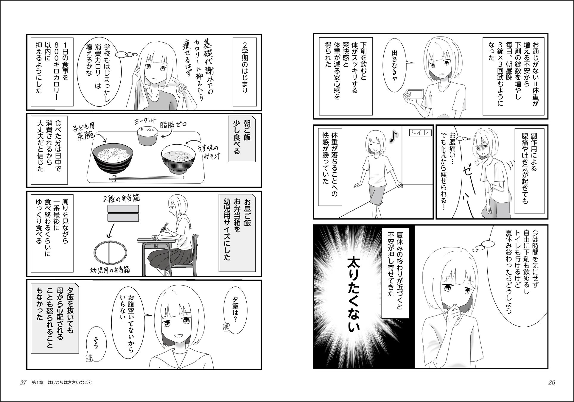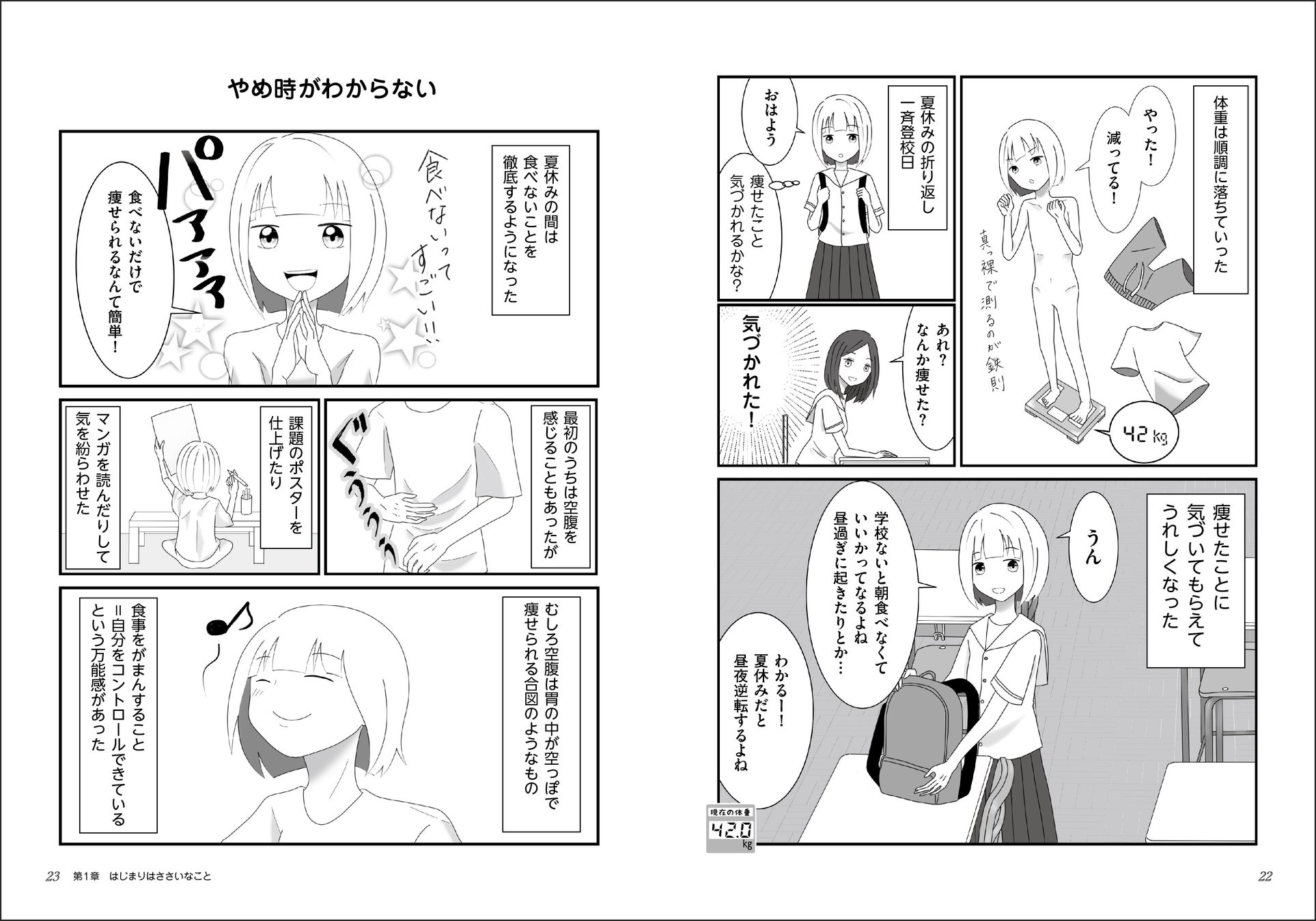 摂食障害の症状、過食と拒食をくり返す日々のこと、家族との関係、学校生活、薬や通院での治療など、摂食障害から抜け出すまでの10年を漫画で描きました。