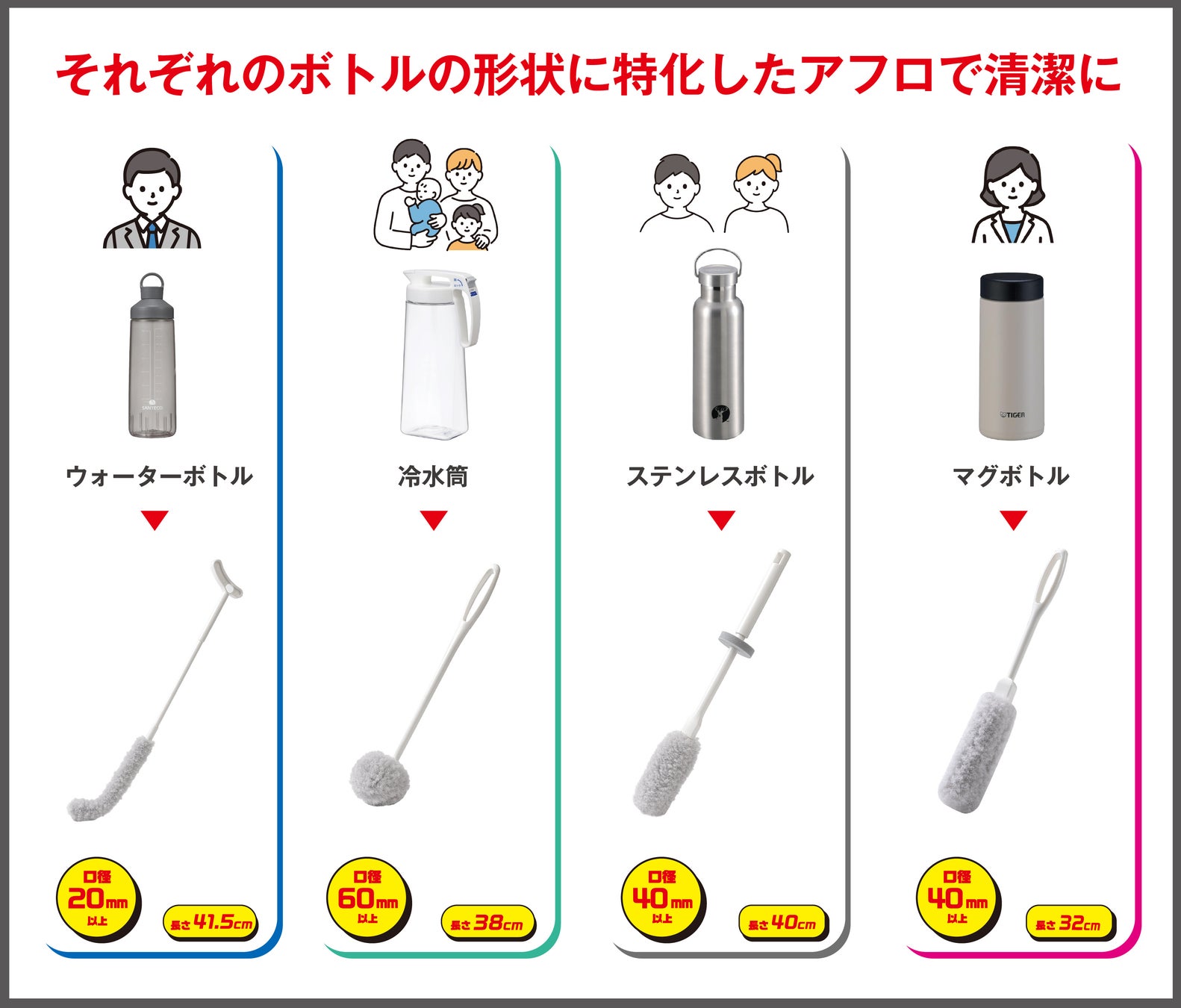 「アフロのひと回し」シリーズは、洗浄部が柔らかいポリエステルの繊維のため、冷水筒やステンレスボトルの底まで届き、傷を付けずに隅々の汚れを落とします。抗菌加工を施した糸を使用しているので、使用後も菌の増殖を抑制し、衛生的です。先端部や持ち手の形状が異なるので、用途に合わせてお好みのものを選んでいただけます。