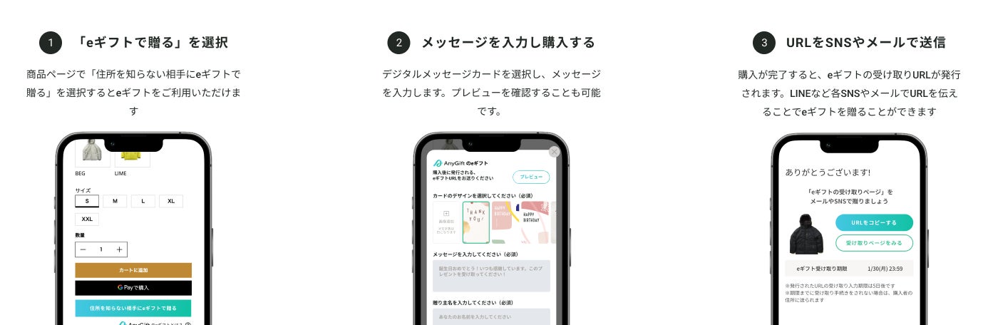 AnyGiftを活用したeギフトでは、住所を知らなくてもSNSやメールで簡単に贈ることができ、受け取る方がご自身で配送先を選択できます。これにより、よりスムーズで心のこもった“贈る体験”をお届けできるようになります。