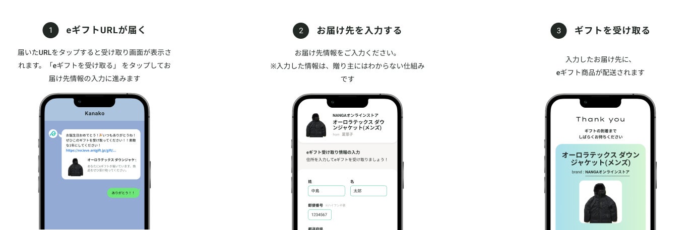 相手の住所を知らなくても、NANGA商品をLINEやメールでギフトとして贈ることが可能に