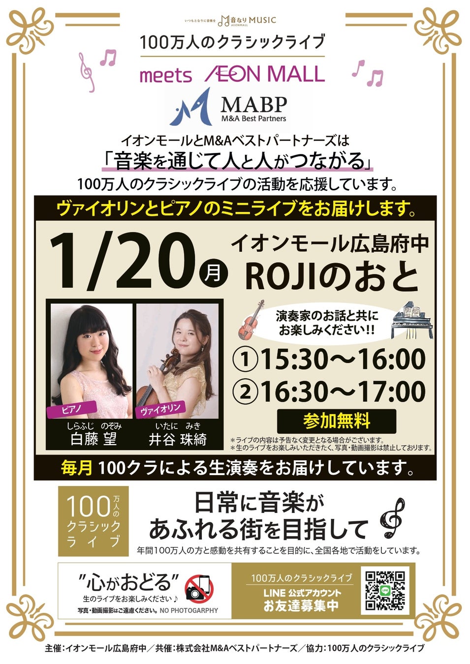 製造、建設、不動産、医療・ヘルスケア、物流、ITに特化したM&A仲介を⾏う株式会社M&Aベストパートナーズ(本社:東京都千代田区、代表取締役社長:齋藤 達雄 以下M&Aベストパートナーズ)は、イオンモール広島府中にて、クラシックライブ(協力:一般財団法人100万人のクラシックライブ 以下100万人のクラシックライブ)を、1月20日(月)に開催することをお知らせいたします。