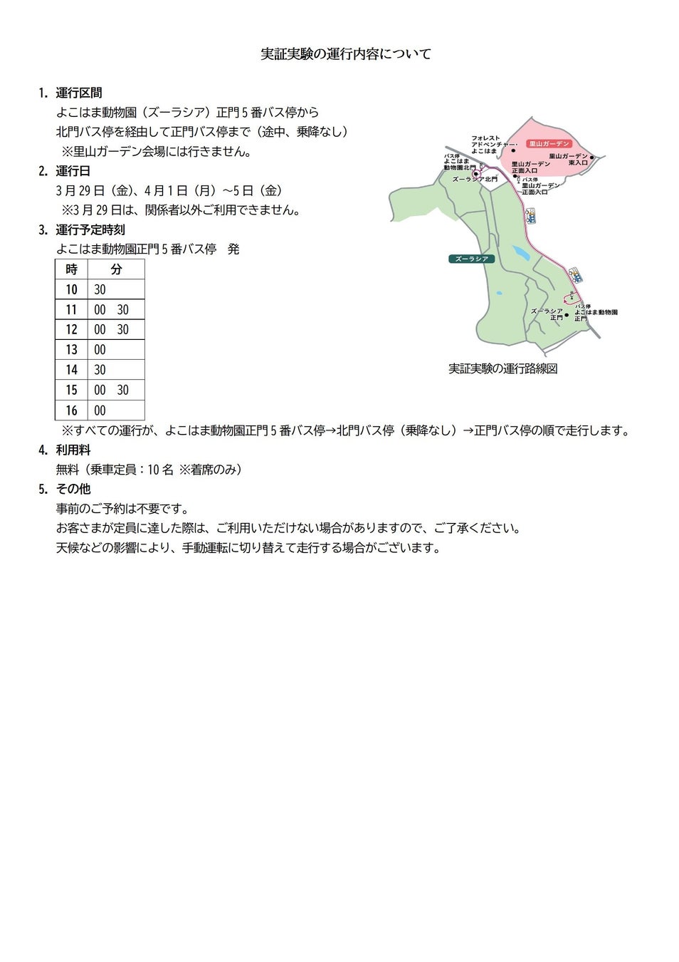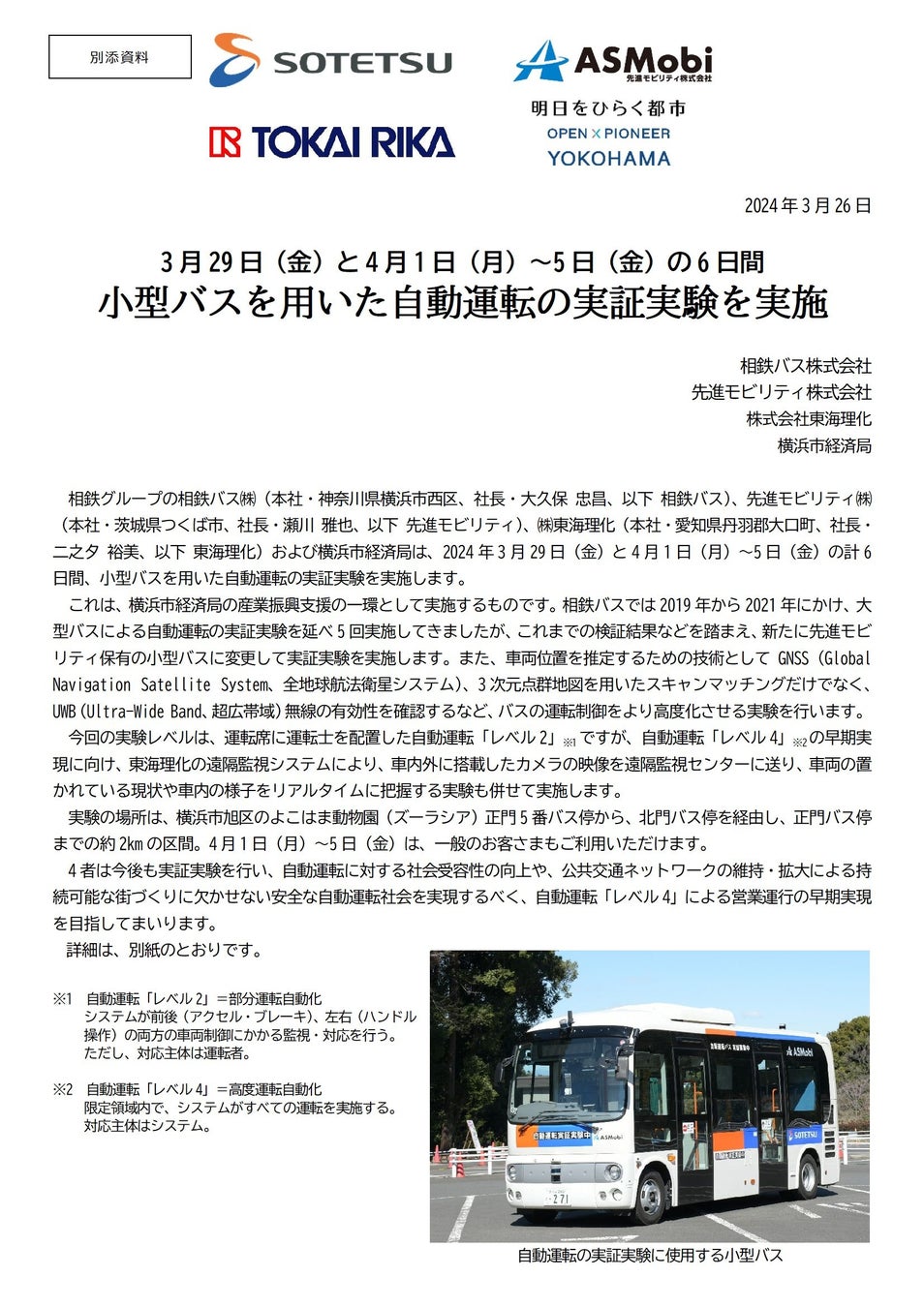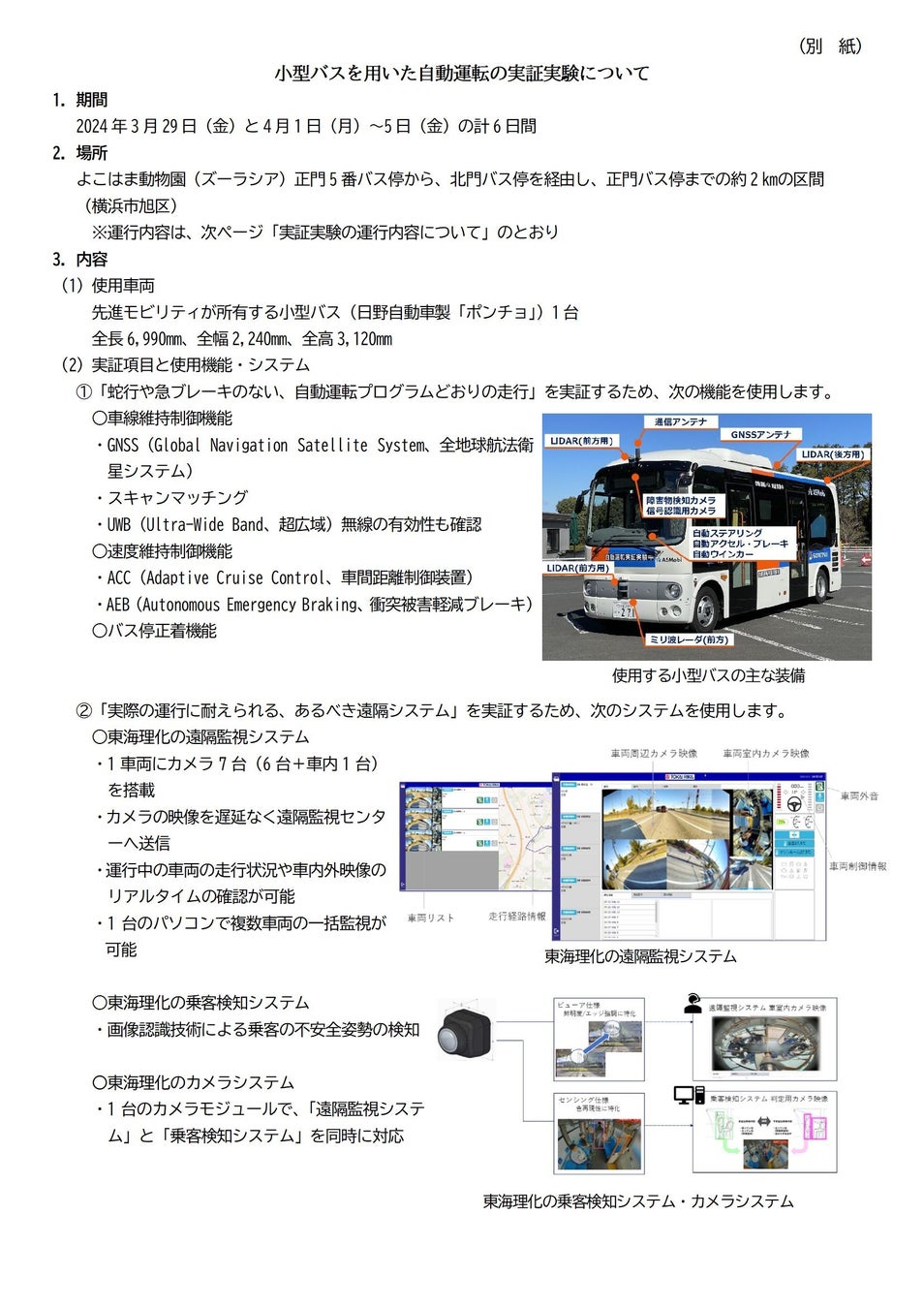 (実証実験の概要は、別添資料『3月29日(金)と4月1日(月)~5日(金)の6日間 小型バスを用いた自動運転の実証実験を実施』をご参照ください。)