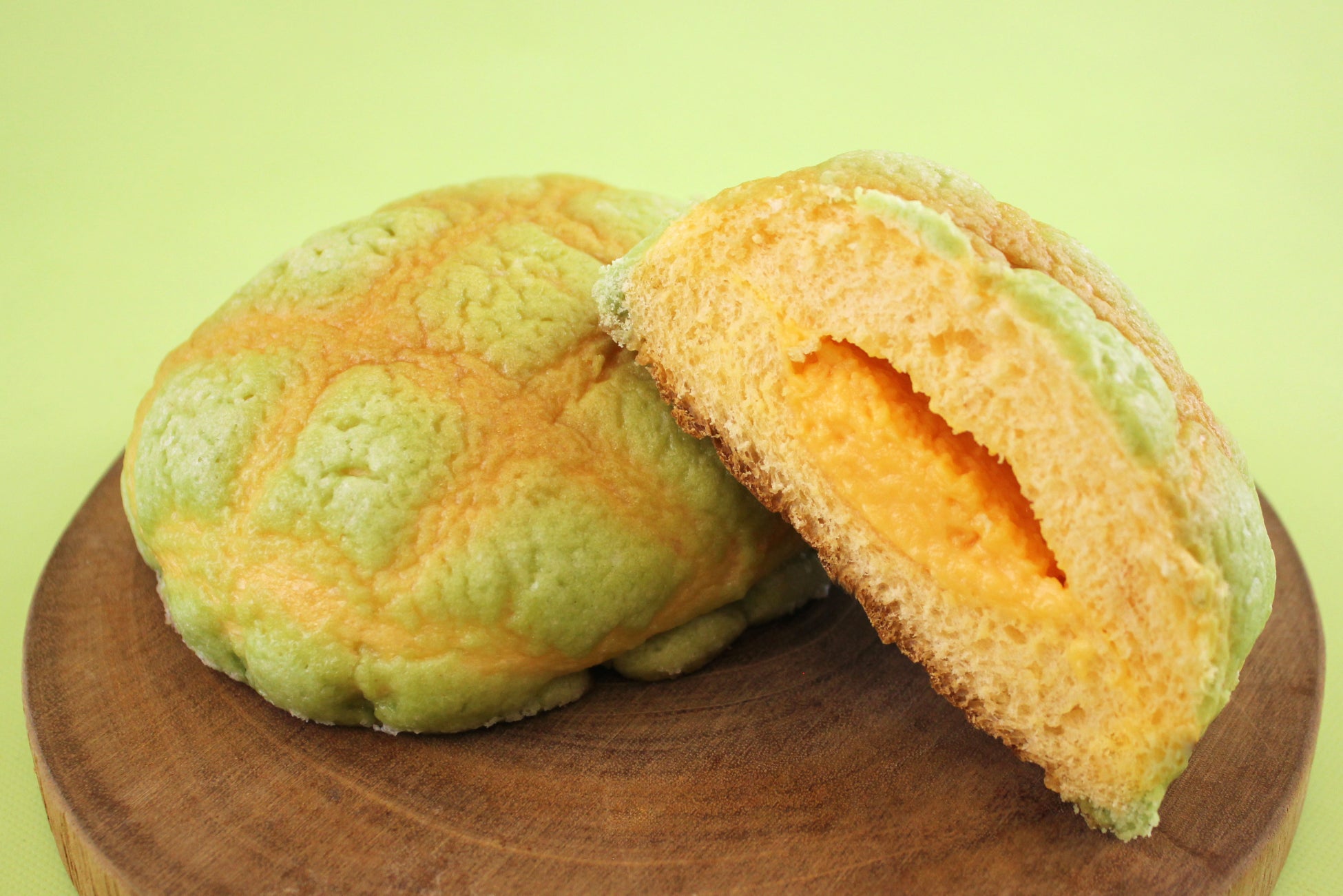 北海道産赤肉メロンピューレ入りのソフトな食感の生地に、メロン風味のクッキー生地をかぶせた、見た目もメロンのようなメロンパンです。メロンそのものを思わせる可愛らしい色味に、完熟した甘みが広がるフルーティーな一品です。