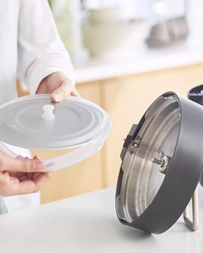 本体サイズは幅22.5cm×奥行24cm。A4スペースのコンパクトさで、狭いキッチンやリビングの空きスペースにもすっきり収まります。上質なマット仕上げの本体と、真鍮調のハンドルが印象的なデザインは、使わないときにそのまま出しておきたくなる佇まい。さらに、自立式の蓋を採用しているので、調理中の置き場にも困りません。パーツは分解して洗えるので、お手入れもラクラクです。
