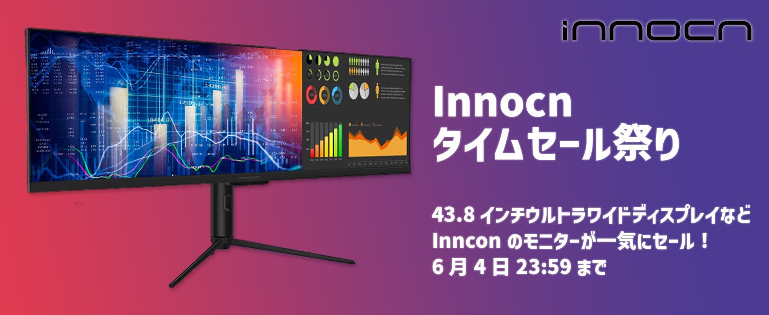 Innocnでは6月4日(日)23:59まで開催中のAmazonタイムセール祭りにあわせて全6製品が最大2.4万円オフになるセールを開催します。セールでは43.8インチのウルトラワイドモニターInnocn44C1Gや、ADSパネル採用の40インチウルトラワイドモニターのInnocn 40C1R、ミニLEDを採用した4KモニターであるInnocn 27M2UなどInnocnが誇る高性能なモニターを大幅に値引き。この機会にInnocn製のディスプレイの性能をご体感ください。