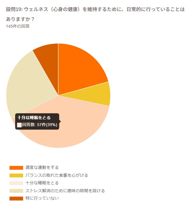 また、趣味の時間や適度な運動など余暇を活用し、ウェルネスの維持を心がけている様子もうかがえます。