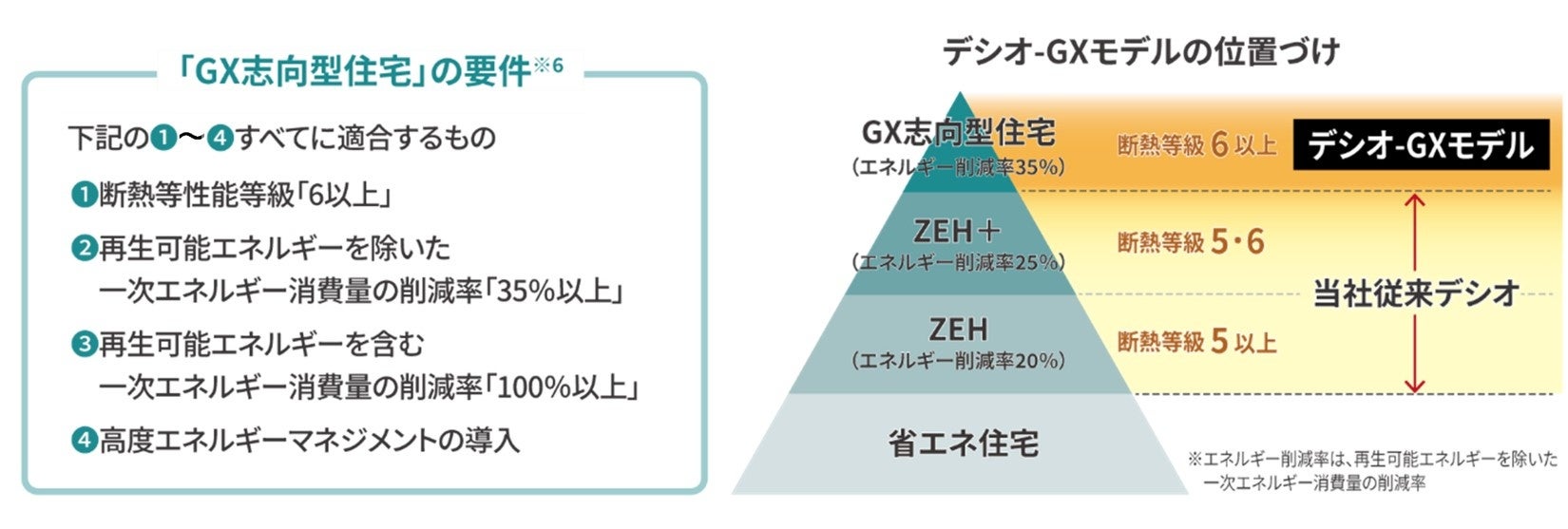当社は、長年にわたり高品質で環境性能に優れた住宅の提供に注力しています。2024年1月より一般地(※4)の平屋・2階建て戸建全商品で断熱等級6仕様を標準化(※5)し、その普及に努めてまいりました。今回、断熱等級6仕様を3階建て住宅に展開し、国のGX志向型住宅の要件(※6)に対応可能な『デシオ-GXモデル』を販売開始。大容量太陽光発電システム(以下PV)と大容量蓄電池、エネルギー管理システム(HEMS)「スマートハイムナビ」(以下HEMS)によるエネルギー自給自足率の高い暮らしで、経済的負担の軽減や災害時のレジリエンス性を確保するとともに、生活シーンに合わせた室内空気環境・温度を整えることで、都市部での快適な暮らしを実現し、サステナブルな社会の実現に貢献してまいります。
