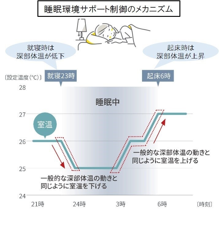 ※9 本製品は室温を管理するシステムであり、居住者の深部体温に働きかけるものではありません。この製品は自動的に眠りや体温を検知して室温を調整するわけではありません。室温が変化する時間は、お客様にて設定・変更いただきます。外気条件により設定温度にならないことがあります。春や秋の中間期は暑さ寒さが発生する可能性があります。その場合は空調をOFFにするか設定温度を変更してください