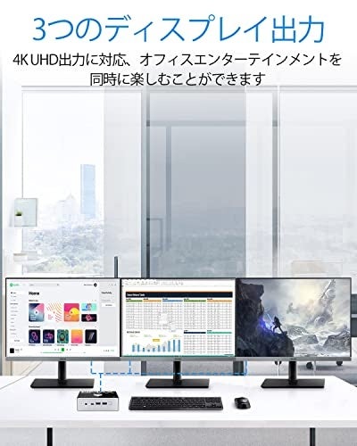 【3画面同時出力可能】4K高解像度に対応するミニPC。HDMI x 2とType-Cにより、テレビ、モニター、プロジェクター、プリンターなどに接続できます。3画面同時出力で生産性を高め、マルチタスク機能を強化します。プロジェクターや店舗、展示会のディスプレイ広告に活用できます。