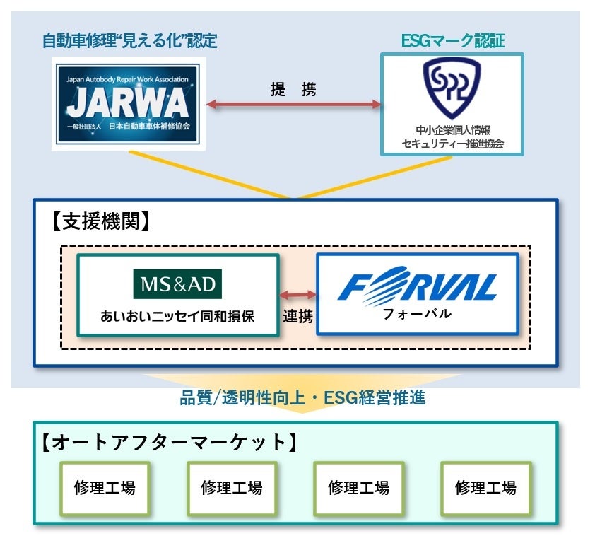 『「新しいあたりまえ」で、新しい世界を創るFORVAL』を理念に掲げる、次世代経営コンサルタント集団である株式会社フォーバル(本社:東京都渋谷区、代表取締役社長:中島 將典、以下「フォーバル」)は、一般社団法人日本自動車車体補修協会(代表理事:吉野 一、以下「JARWA」)が2024年7月1日より立ち上げる自動車修理工場のサービス品質認定制度「自動車修理“見える化”認定制度 」の開始を受け、MS&ADインシュアランス グループのあいおいニッセイ同和損害保険株式会社(代表取締役社長:新納 啓介、以下「あいおいニッセイ同和損保」)と全国の自動車修理工場に対し、ESG経営を推進していく取り組みに合意したことをお知らせいたします。