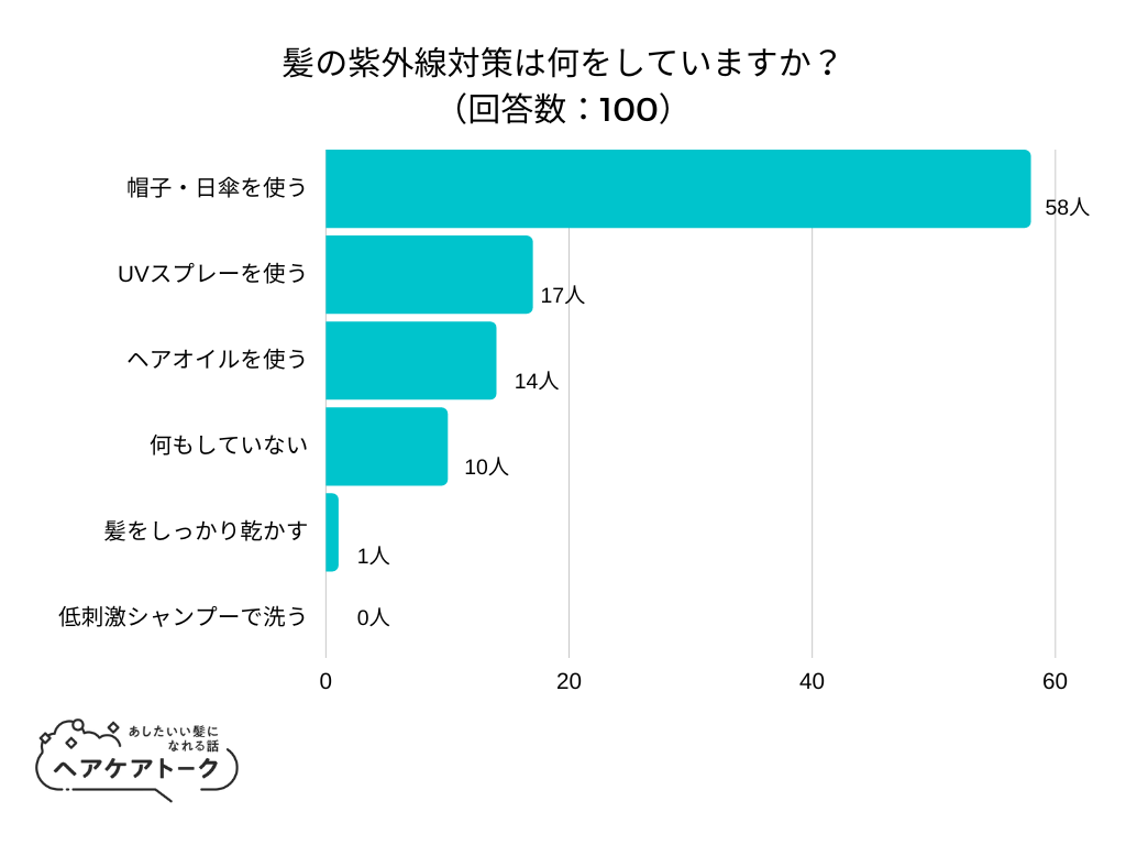 「髪の紫外線対策は何をしていますか?」とアンケート調査した結果、1位は『帽子・日傘を使う』でした。