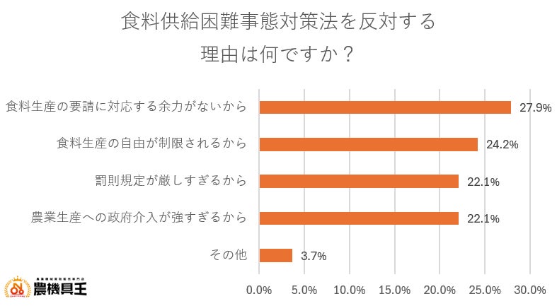 食料供給困難事態対策法を反対の理由は、「余力がない」が27.9%、「自由が制限される」が24.2%、「罰則が厳しい」と「政府介入が強すぎる」が22.1%でした。人手不足や高齢化の中、十分な補助がなければ増産は困難と考えられています。