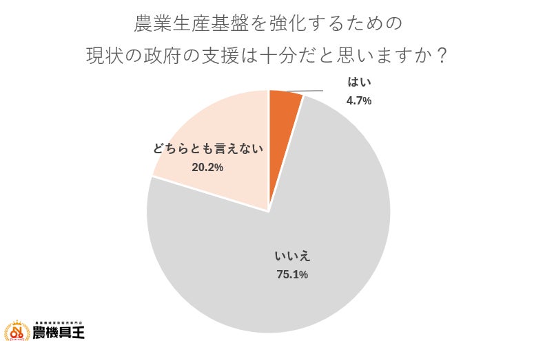 農業生産基盤の強化するための、現状の政府の支援は十分だと思いますか?と聞いたところ、「はい」が4,7%、「いいえ」が75.1%、「どちらとも言えない」が20.2%となりました。農家の4人に3人が政府の支援に不満を持っていることが分かりました。