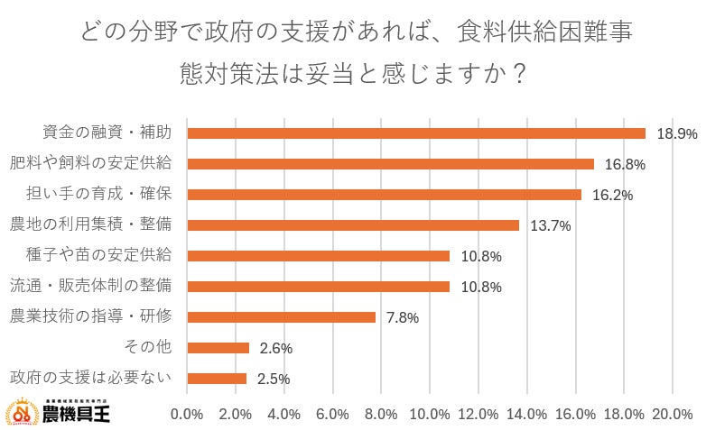 なお、どの分野で政府の支援があれば、食料供給困難事態対策法は妥当と感じますか?と聞いたところ、「資金の融資・補助」が18.9%、「肥料や飼料の安定供給」が16.8%、「担い手の育成・確保」が16.2%となりました。天候などによる農作物の不作が続く中、政府からの資金援助や肥料の安定供給を強く求める農家が多いようです。 また、農業従事者の減少が進むなか、新規就農者の増加を望む声があることもわかりました。