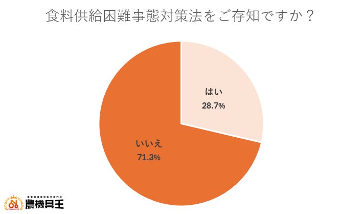 食料供給困難事態対策法をご存じか聞いたところ「はい」が28.7%、「いいえ」が71.3%でした。